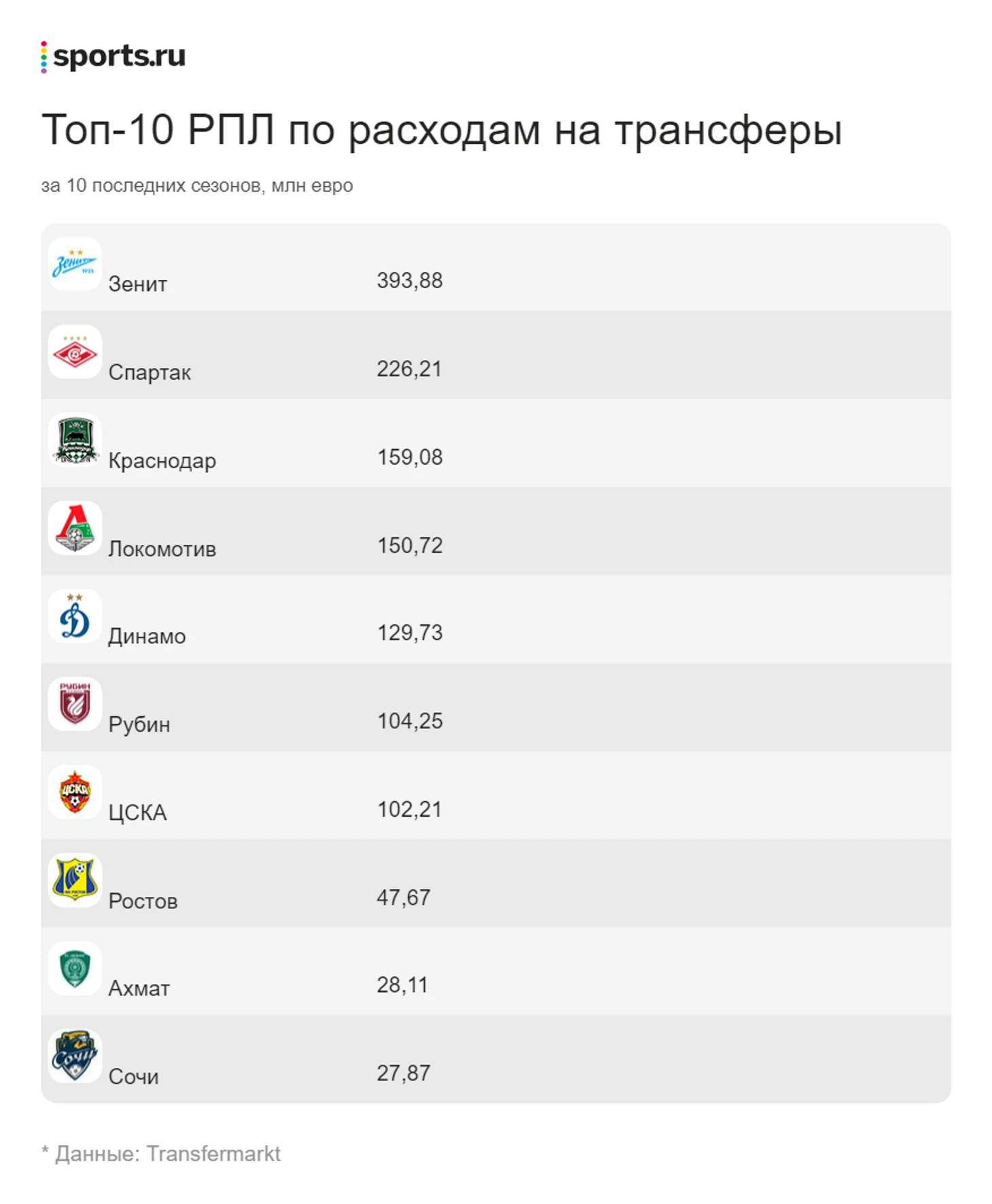 ● 1369,73 млн евро – это общая сумма покупок у первой десятки. «Спартак» и «Зенит» вместе потратили 620 миллионов – это 45% всех трат. Расходы еще пяти клубов в общей сложности перевалили за сотню миллионов.