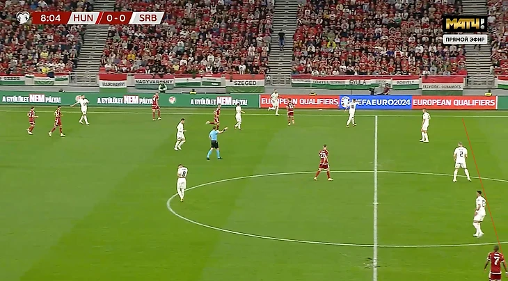 Обратите внимание, какой любопытный разрыв получился благодаря прессингу Сербии. Защита выиграла мяч, а в зоне подбора его уже ждал полузащитник, готовый беспрепятственно начал атаку.