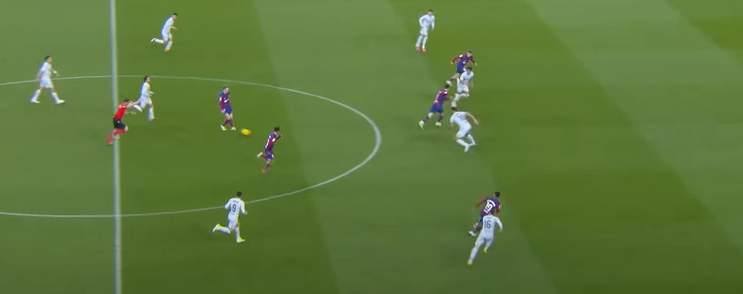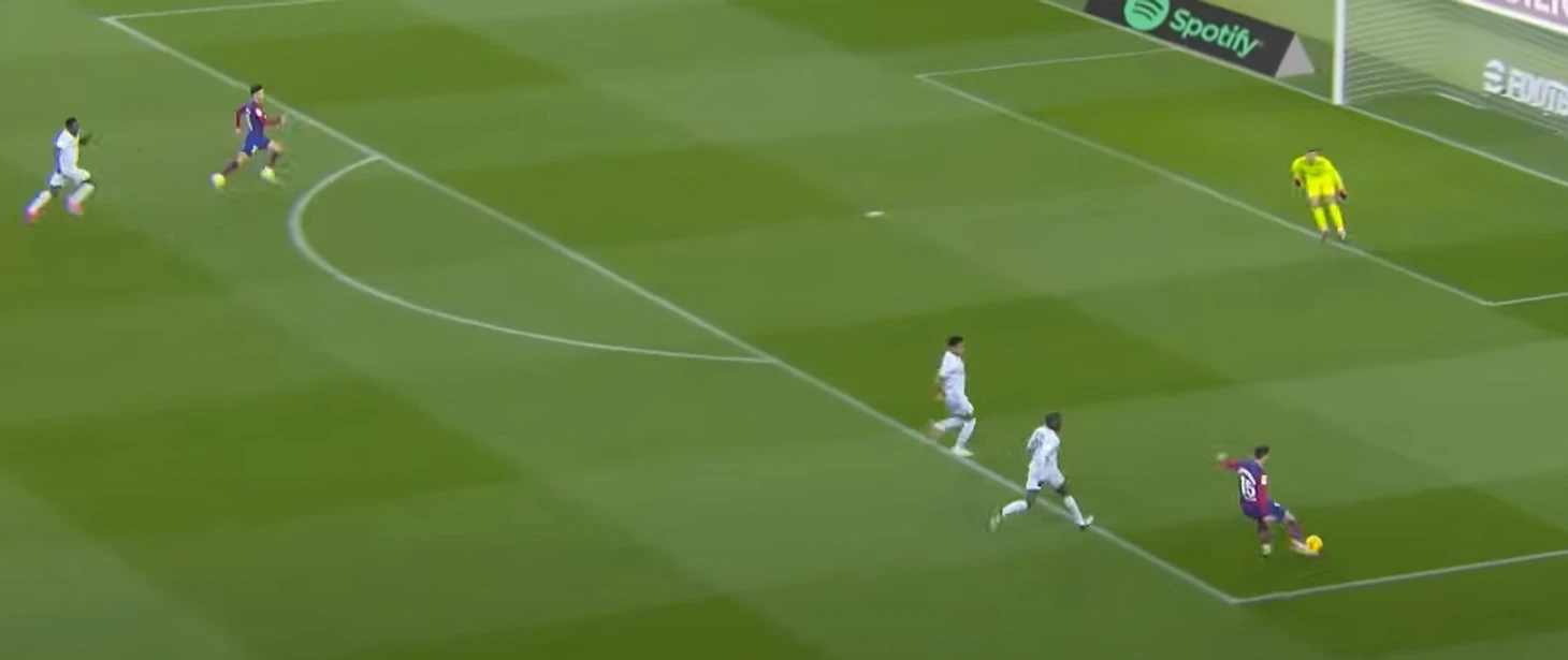 В этом матче оборона «Хетафе» играла невероятно высоко, что очень сильно удивило меня. И к счатью, каталонцы почти сразу поняли как этому можно использовать в свою пользу. Вместо большого количества передач и раскатов игроки стали забрасывать за спину защитникам соперника. Главным адресатом был конечно же Рафинья, очень здорово бразилец выглядел после травмы и было видно, что вышел на матч очень заряженным. До первого гола таких забросов я насчитал 4 штуки, 2 из которых были со своей половины поля.