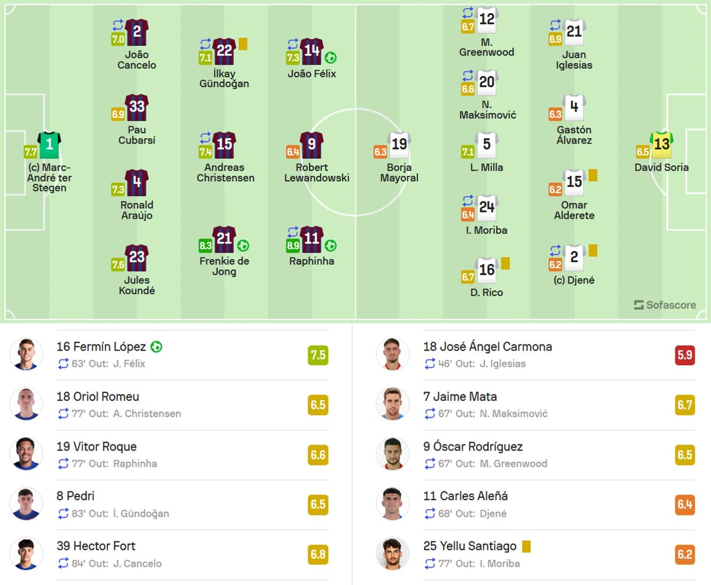 В стартовый состав вернулись Рафинья и Феликс, также Педри предоставили отдых, а в паре с Араухо вышел Кубарси. Такой стартовый состав обещал кучу опасных моментов в .
