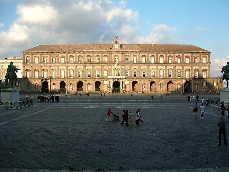 Вдоль восточной стороны площади Пьяцца-дель-Плебисцито находится бывший Королевский дворец , построенный в 17 веке Доменико Фонтана и восстановленный в первой половине 19 столетия. Это великолепное здание в стиле барокко и неоренессанса, а также один из четырех дворцов, которые использовались в качестве королевских резиденций. На длинном фасаде дворца расположены восемь мраморных статуй королей, правивших Неаполем. Внутри можно увидеть оригинальную парадную лестницу из белого мрамора, построенную в 1651 году, театр и более двух десятков комнат с старинной мебелью, гобеленами, фарфором и скульптурами.