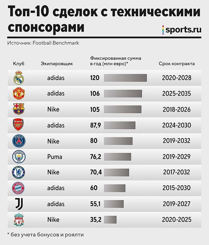 Sport пишет, что Puma и «Ман Сити» якобы недавно пересмотрели условия контракта, и теперь клуб из Манчестера якобы получает 167 млн евро за сезон, но официальных подтверждений этому нет. У «Ливерпуля» фиксированная сумма всего 35,2 млн – но за счет уникального контракта с Nike мерсисайдцы получают 20% от продажи экипировки. Суммарно капает под 100 млн.