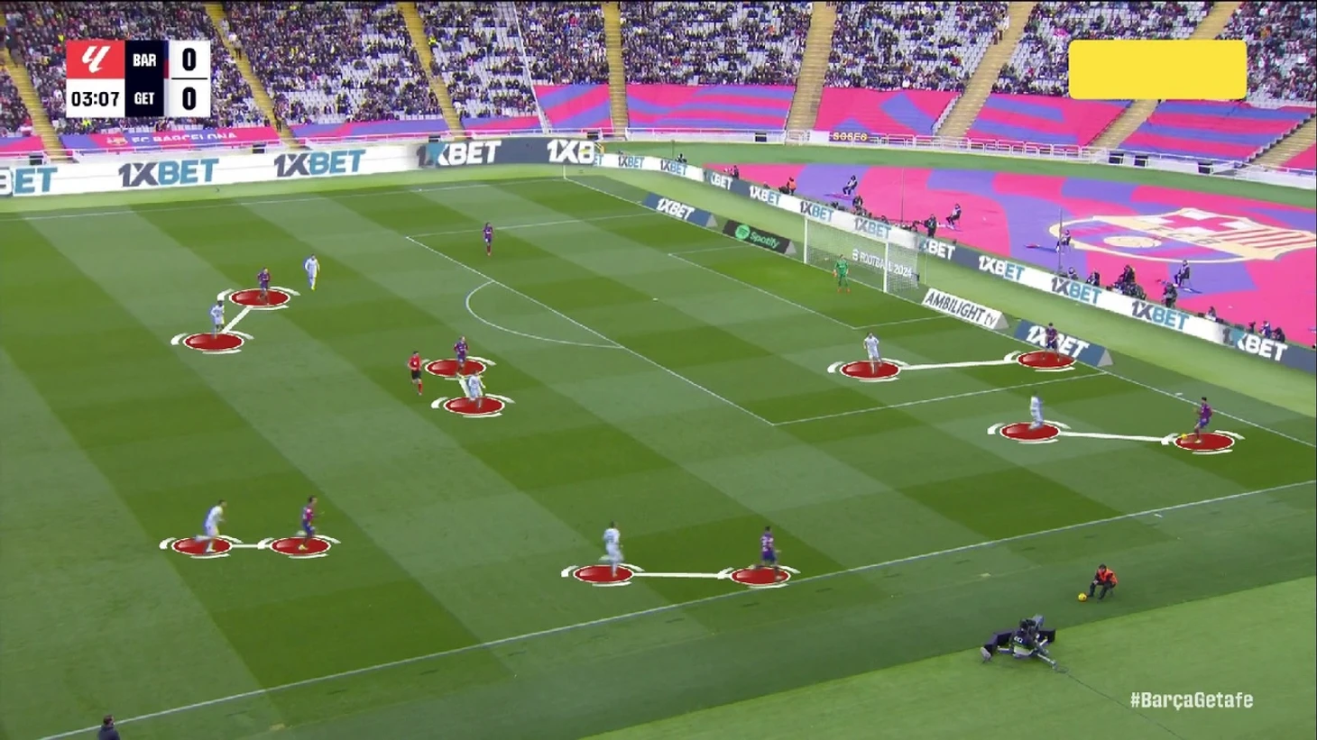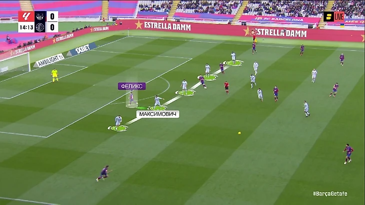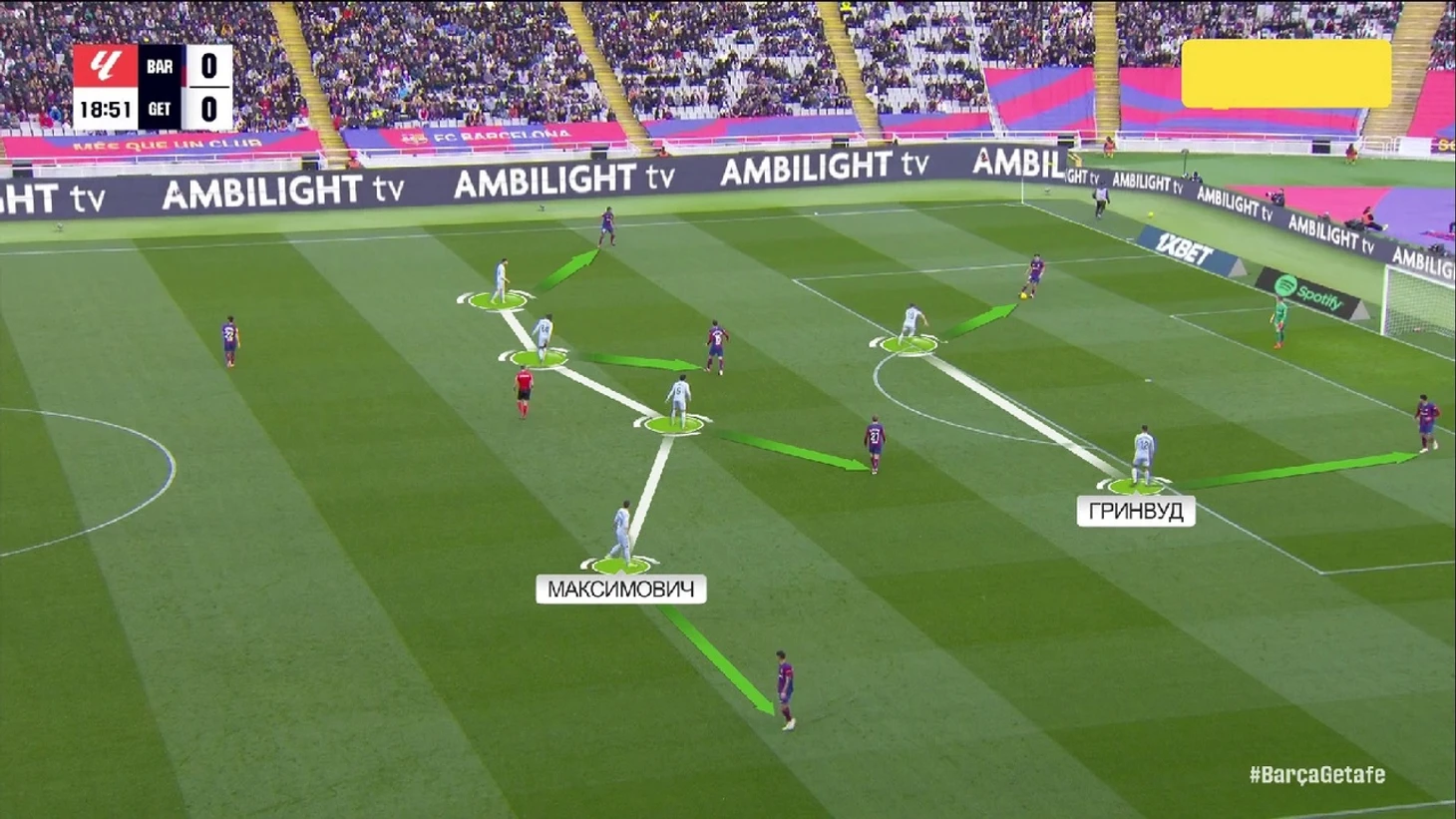 При игре без мяча Бордалас не поставил автобус, как это было в первом туре. «Хетафе» вообще в последнее время так не играет, вот решили и на «Барсу» не менять план. Базовая модель – 4-4-2, но на практике это был прессинг 1-в-1 по всему полю. Гринвуд оставался на одной линии с Майоралем, а Максимович был правым полузащитником: