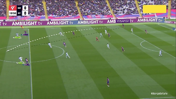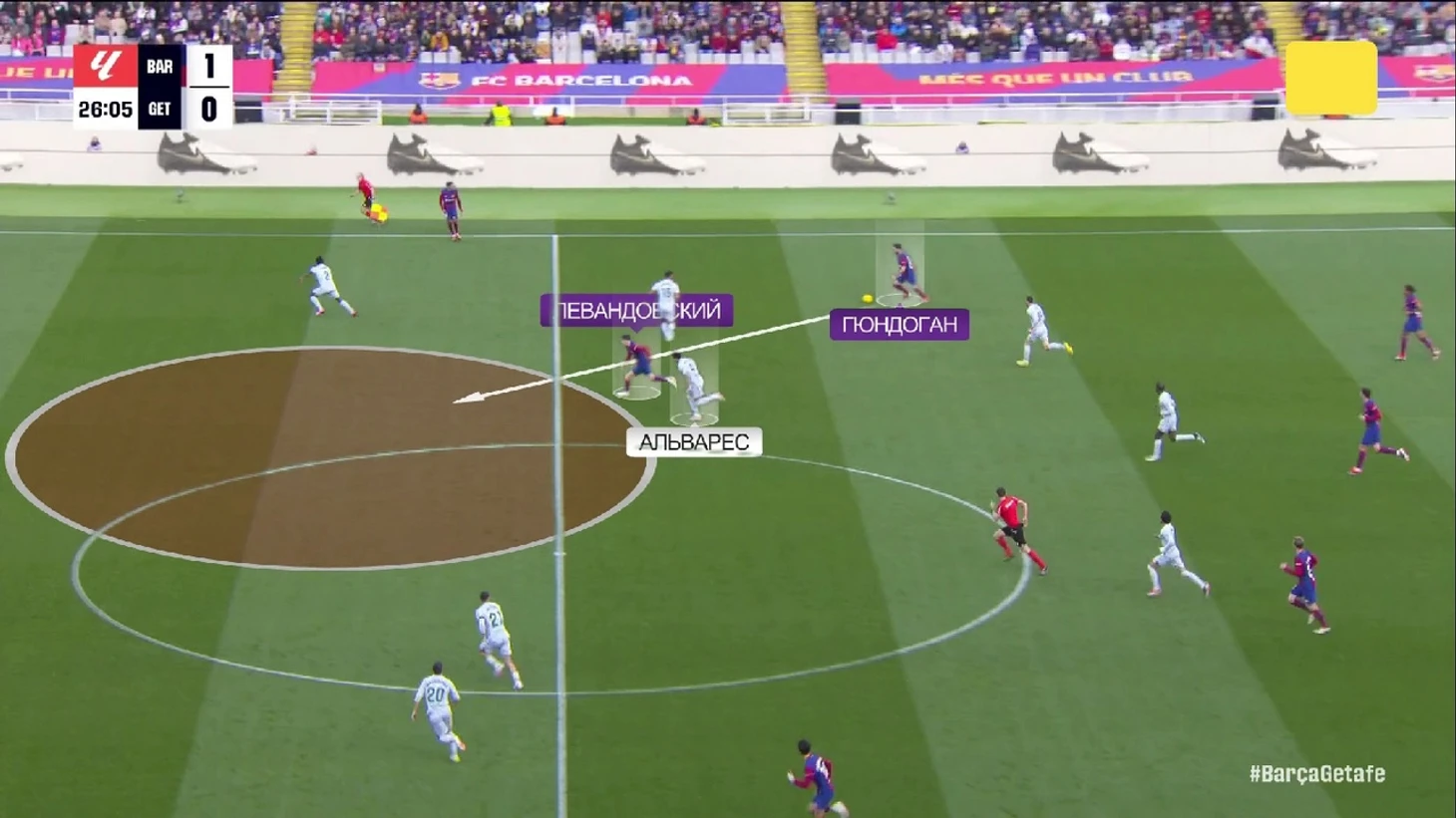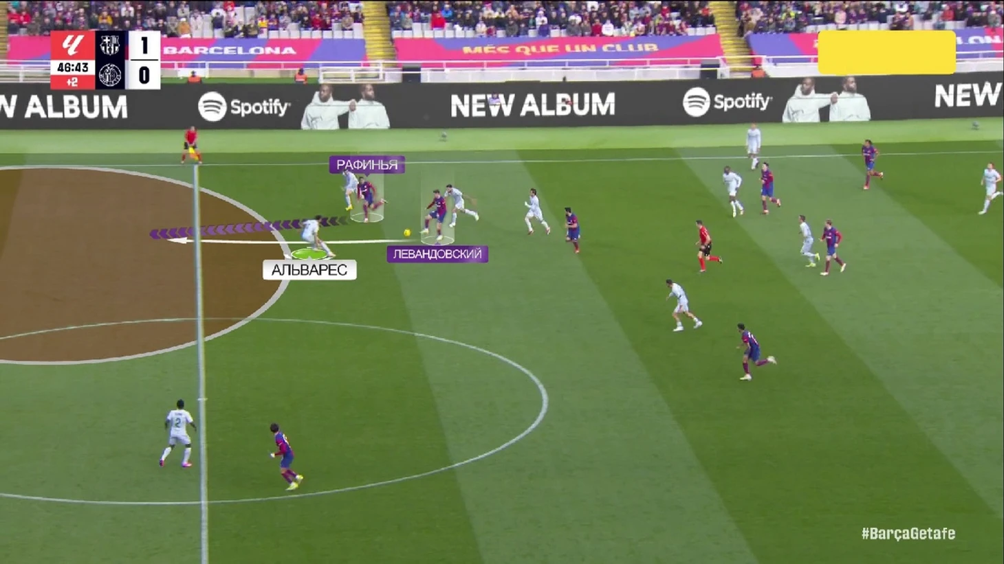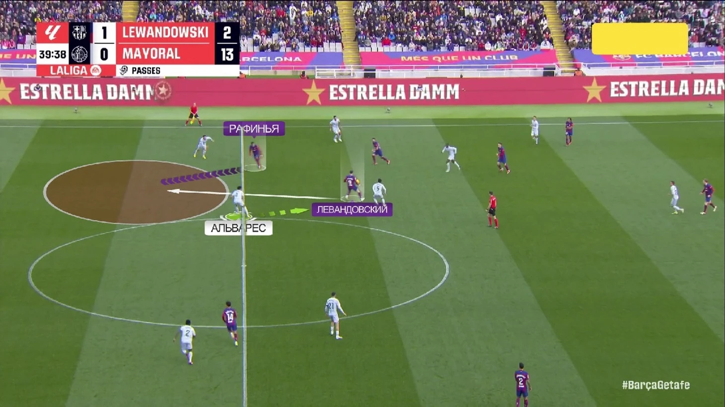В этом матче получилось так, что Левандовский невольно стал ложной девяткой. Он в этом сезоне постоянно опускается глубже, но именно против «Хетафе» с таким планом это оказалось максимально уместно. Сам Роберт почти не получал возможностей забить, но зато создал просто кучу возможностей для Рафиньи – как раз идеального вингера под систему с ложной девяткой (из-за того, как он открывается). Часто Левандовский и напрямую обострял на бразильца: