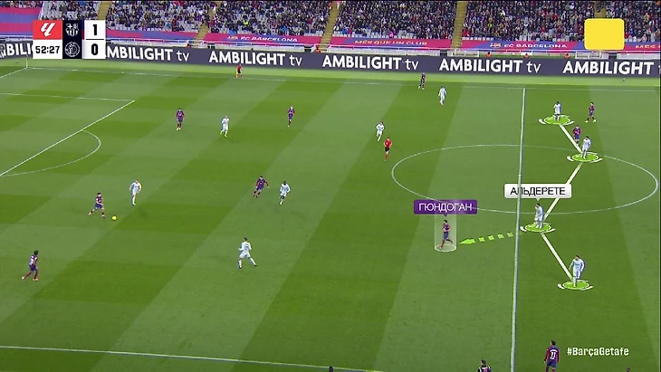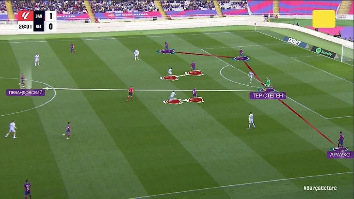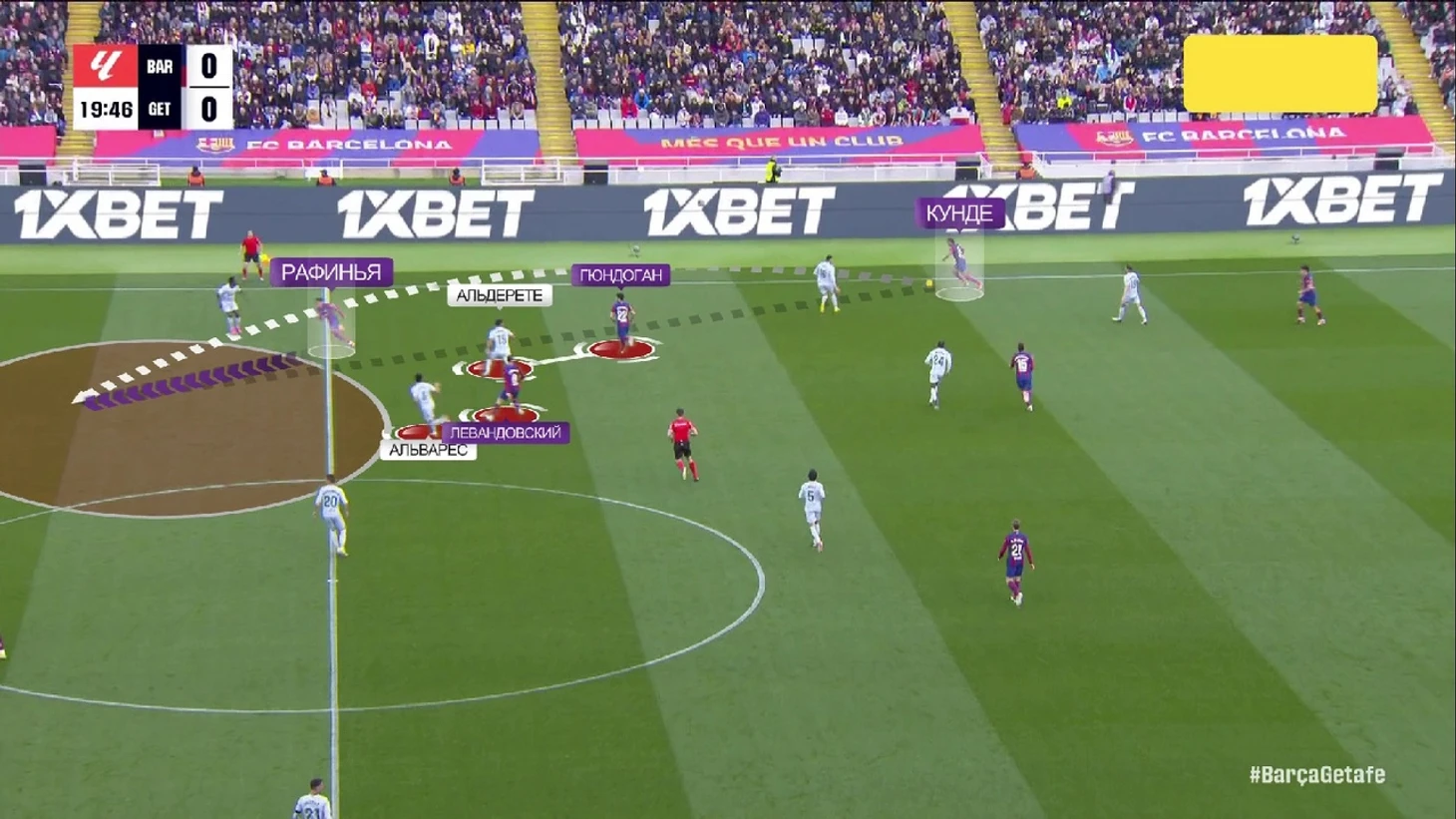 Первый гол – просто идеальная иллюстрация. Кунде получил секунды свободы (в том числе и из-за того, что «Хетафе» следил за тер Стегеном), а Рафинья атаковал пространство за спиной защитников – вот и 1:0: