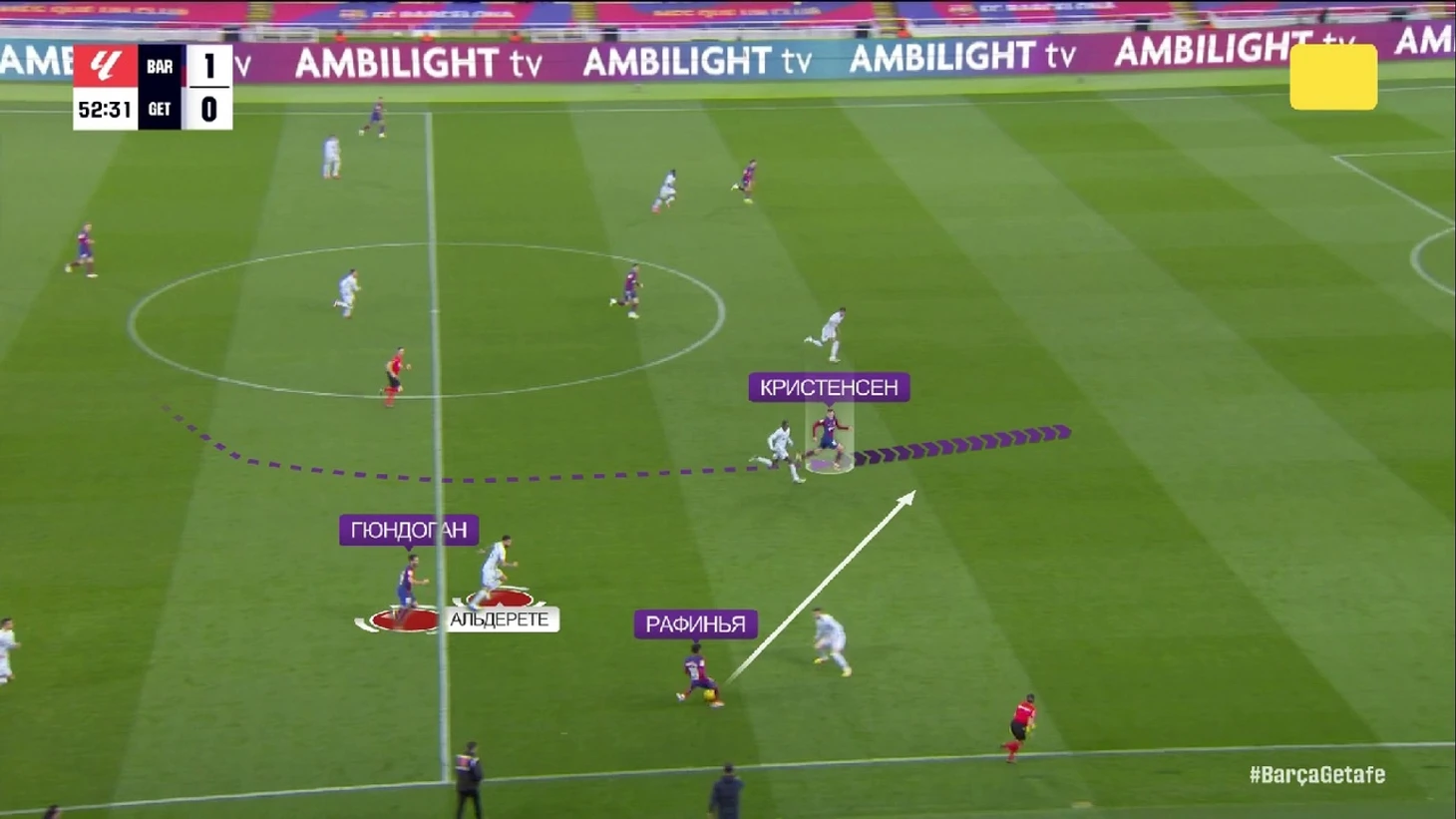 Как мы уже говорили ранее, соотношение сзади у «Хетафе» оставалось 1-в-1. На Левандовском и Гюндогане буквально «висели» центральные защитники гостей – Альварес и Альдерете. «Барса» стала этим пользоваться – тянули защитников как можно дальше, чтобы кто-то другой открылся им за спину в свободное пространство. Чаще всего этим «кем-то другим» был Рафинья – именно он получил больше всего моментов в этой игре.