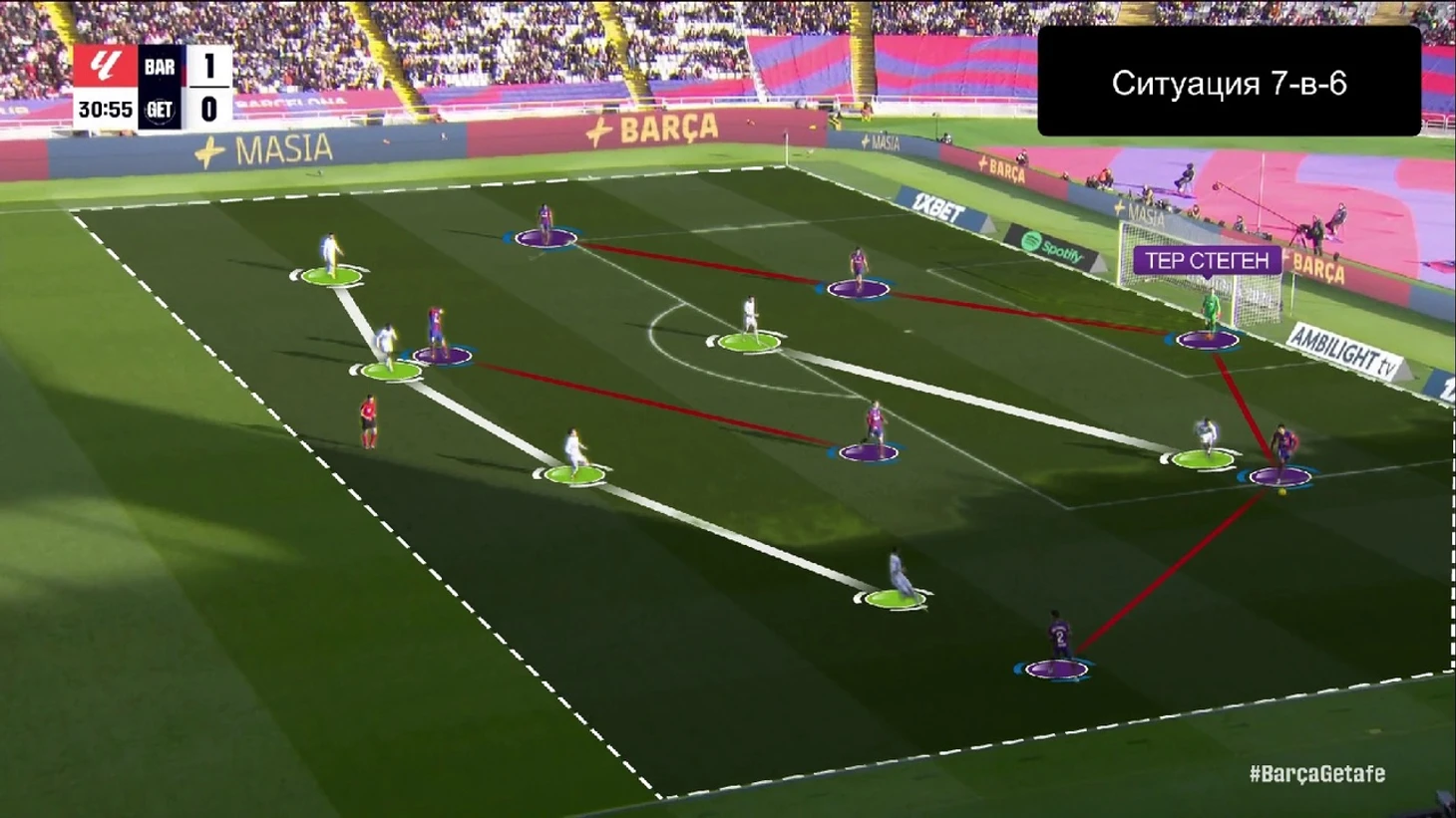 Получив свободу, он мог либо напрямую обострить с помощью заброса, либо оставить кого-то другого в первой стадии свободным (за счёт того, что кто-то из соперников переключится на него). Мы все знаем, что высокая линия + отсутствие прессинга – убийственное сочетание. «Хетафе» при высокой линии не отказывался от давления, но в том числе и из-за тер Стегена, за которым нужно следить, создавались ситуации с «открытым мячом». Получалось примерно тоже самое, что и при высокой линии без прессинга.