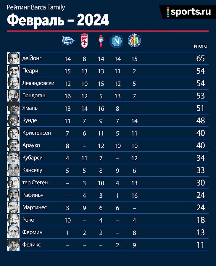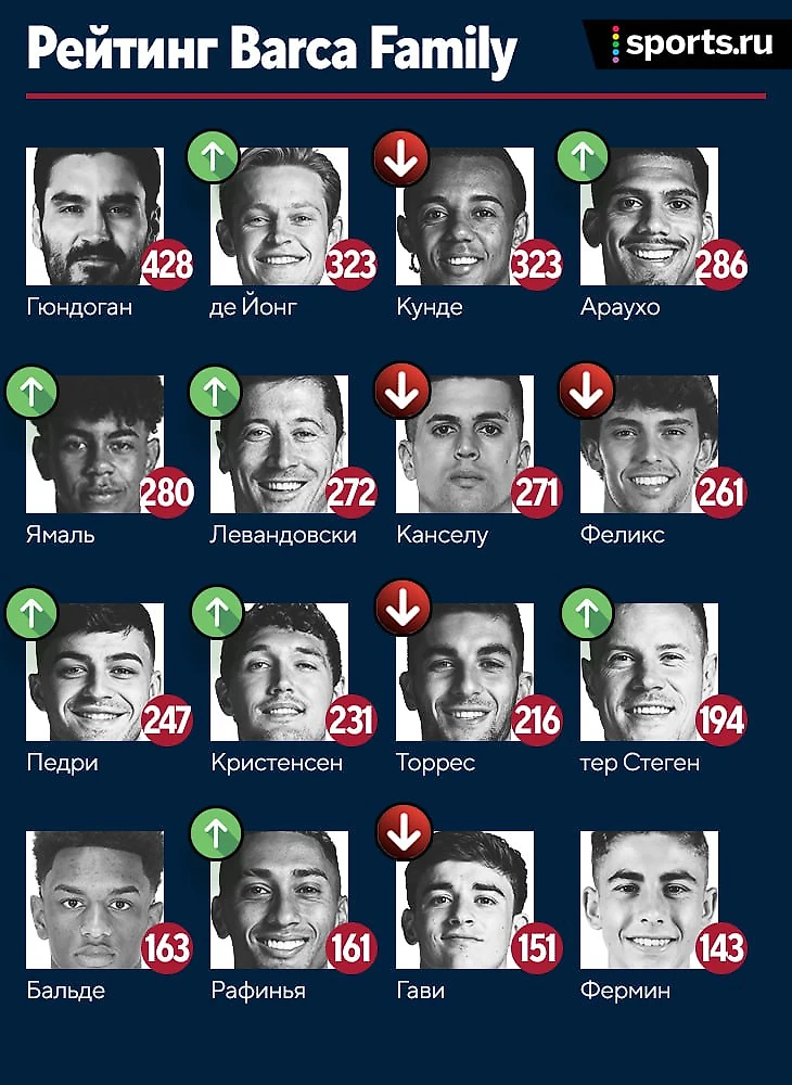 Илкай Гюндоган обеспечил себе комфортный отрыв от ближайших преследователей и пока не собирается сбавлять обороты. После травм взлеты в таблице продолжают Педри и Араухо, а успешный месяц Роберта Левандовски предоставил ему возможность наверстать упущенные позиции. Самый удивительный – Ламин Ямаль. Парень не только обставил Рафинью в конкуренции за позицию, но и вошел в пятерку лучших футболистов текущего сезона. В шоке были даже люди из «Adidas», которые сразу предложили солидный контракт молодому таланту.