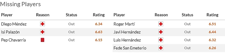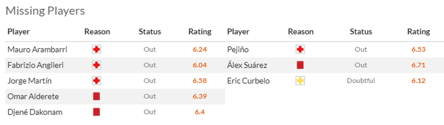 Хотя у Хетафе и так проблем выше крыши, из-за перебора карточек(сюрприз-сюрприз) ближайший тур синхронно пропустят два основных защитника Альдерете(5,5) и Джене(6). У гостей по аналогичной причине останется загорать на Канарах Алекс Суарес(5).