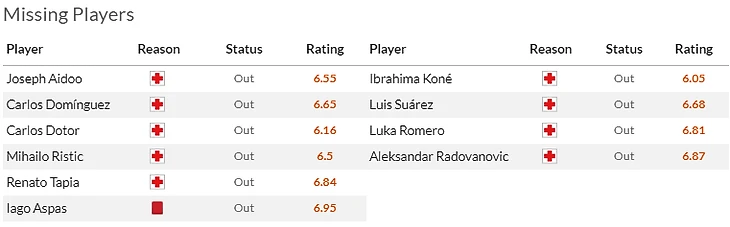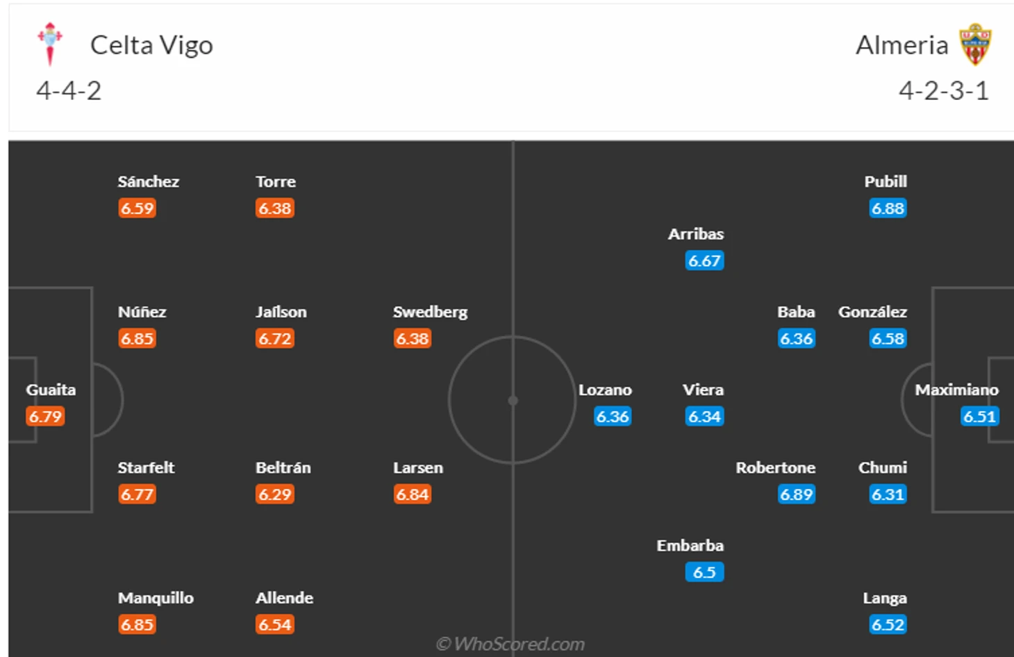 Дополнительная проблема состоит в том, чо выходить на ответственный матч галисийцам придется без своего духовного лидера Яго Аспаса(8) отхватившего дисквалификацию, а также без травмированных Тапии(6) и Сведберга(6). А вот Альмерия успела восстановить ярко проведшего прошлый тур Ромеро(6) и может устроить Сельте внезапный головняк .