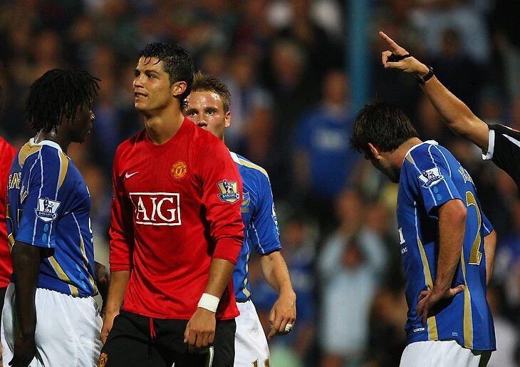 ● Следующая, такая же крупная, случилась лишь через полтора года: Криштиану не закончил матч с «Портсмутом» (1:1) из-за агрессивного поведения в чужой штрафной. Во время розыгрыша углового в концовке португалец боднул соперника прямо перед судьей: тот незамедлительно показал прямую красную.