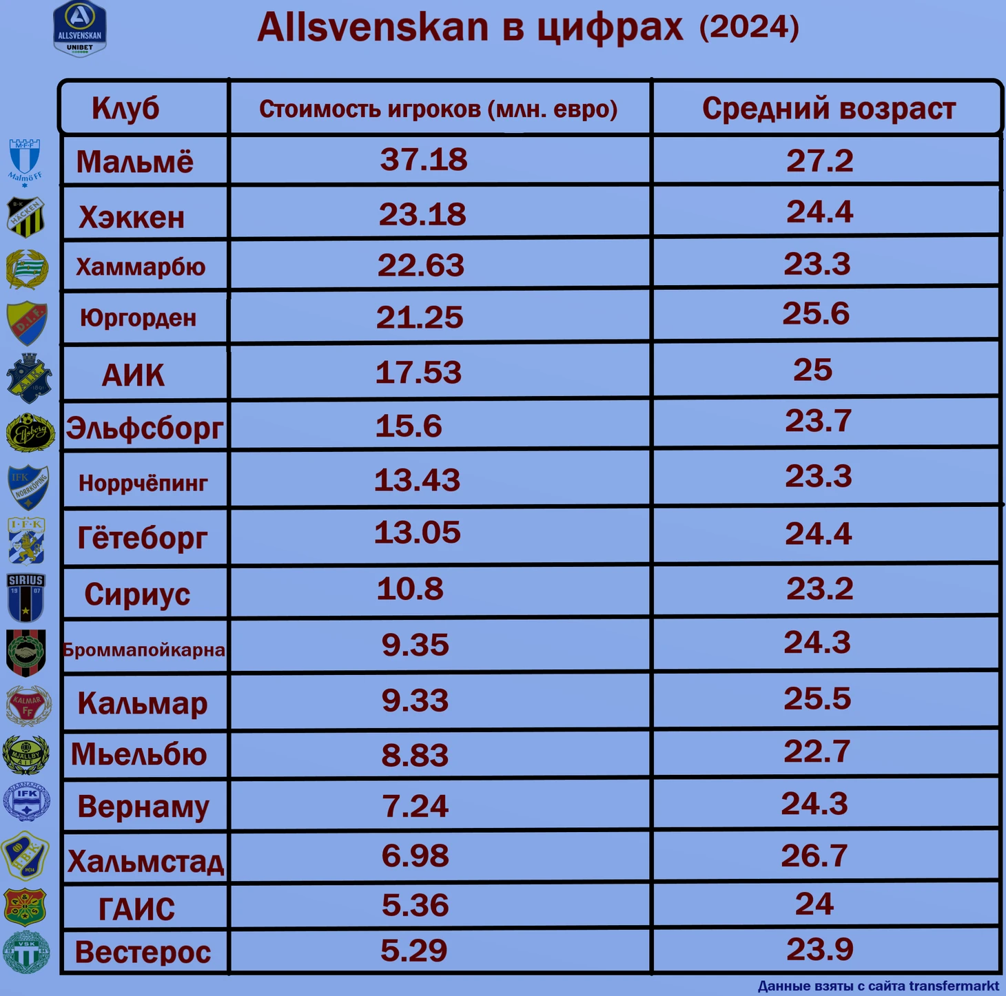 Общая стоимость игроков Шведской лиги составляет всего 226 млн. евро, а самый дорогой игрок это Себ Нанаси, который оценивается в каких-то 5 млн. евро. Лично моё мнение, цены на игроков в лиге бывают слишком малы, но таков чемпионат Швеции, такая её репутация, хотя это уже совсем другая история...