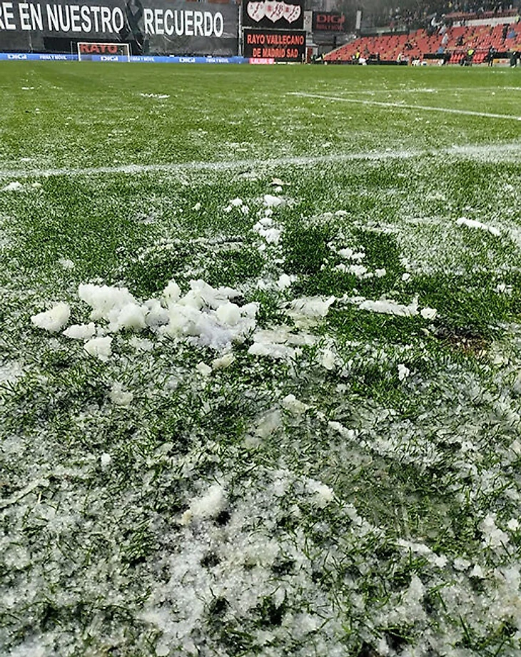 В столице Испании внезапно начался град, сильный ветер и снег. Да, снежные матчи проходят не только в России.