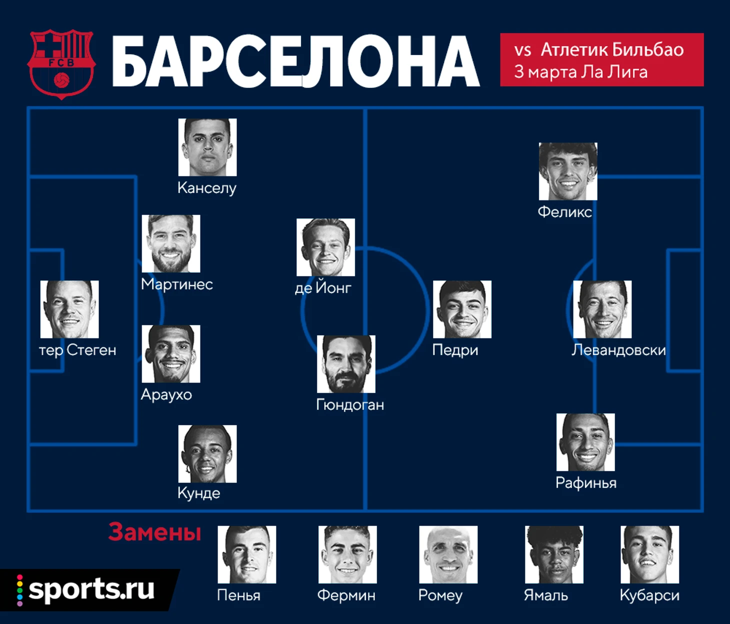 Жоау Феликс должен вернуться на вакантную позицию слева на фланге. Португальцу нужно показать высокий уровень при игре с мячом и без него. От его выступления будет зависеть очень многое. А вот Ламин Ямаль наверняка станет опцией для второго тайма, уступив стартовую позицию Рафинье.