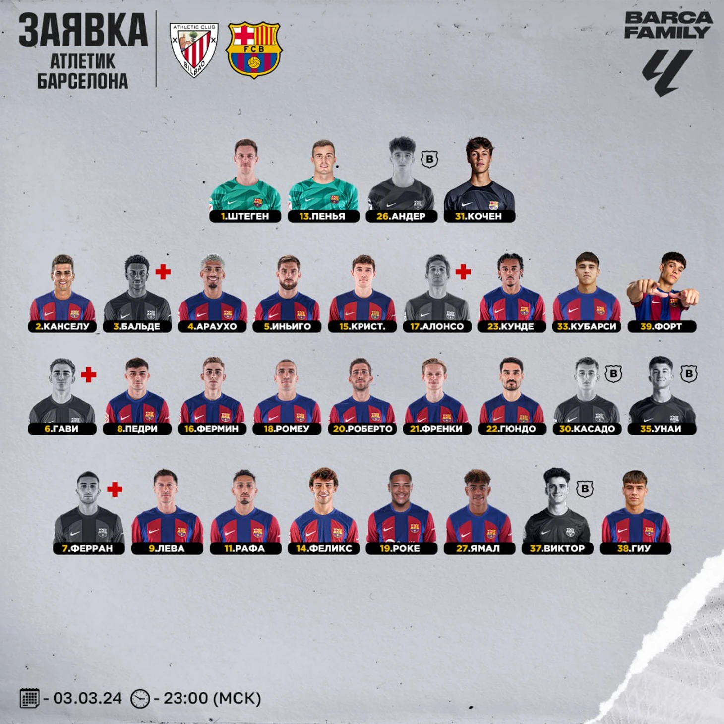 1. Алехандро Бальде – травма. 2. Маркос Алонсо – травма. 3. Гави – травма. 4. Ферран Торрес – травма.