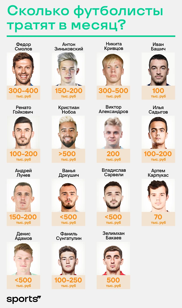 ● Антон Зиньковский, «Спартак»: «Честно, вообще мало. На еду, иногда на рестораны (это раз в неделю) и родителям отправить. Больше ничего. Ну, тысяч 150-200».