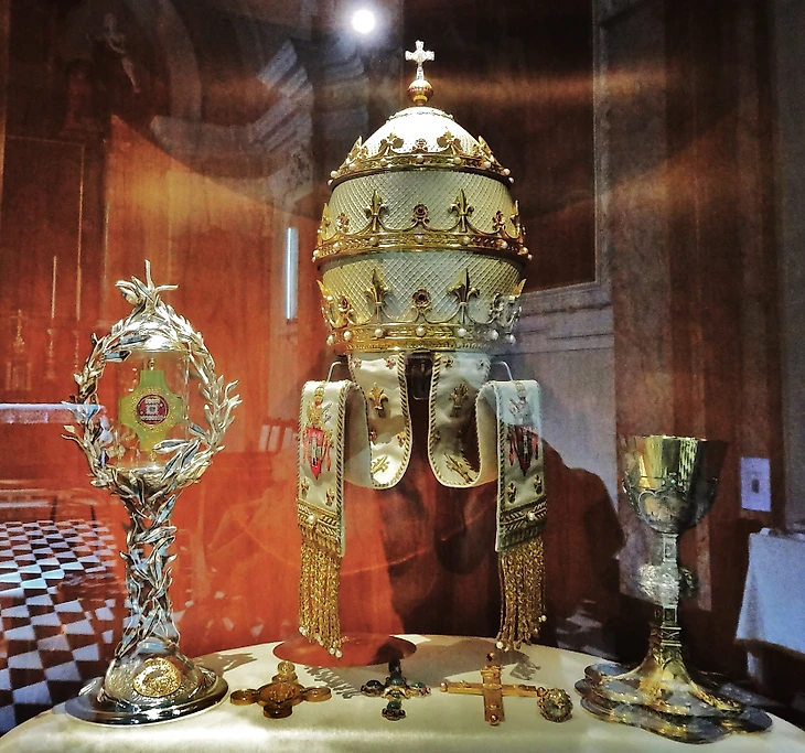 Но самый ценный объект, который можно здесь увидеть - это, конечно же, тиара Папы Иоанна XXIII, сегодня почитаемого как святого, родом из местечка Сотто-иль-Монте в провинции Бергамо. Тиара представляет собой сверкающий головной убор из золота, усыпанный жемчугом, рубинами, алмазами и изумрудами, созданный литейщиком Аттилио Нани.