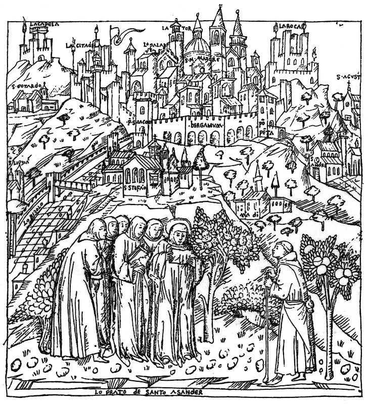 Власть церкви просуществовала до 1098 года. Далее Бергамо стал свободным городом, но после нескольких войн с Брешией был присоединен к Ломбардии. Начиная с XIII века, в рамках борьбы между гвельфами и гибеллинами, Бергамо попадает под влияние Милана.