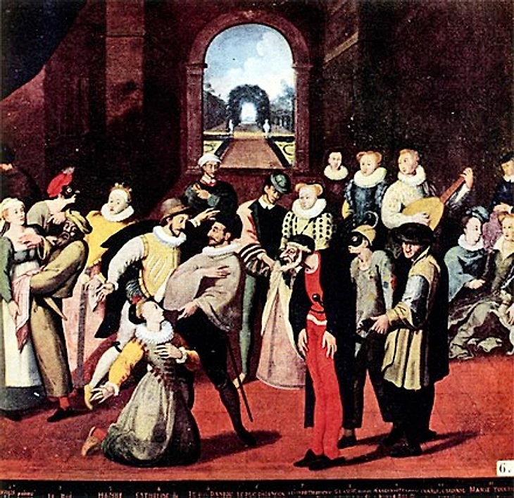 Сцена из комедии дель Арте, сыгранная во Франции перед знатной аудиторией в 1571 или 1572 году(Музей Байе).