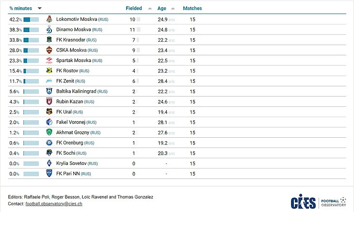 Из рисунка мы наблюдаем тенденцию к использованию внутренних резервов в основной команде среди больших клубов российского футбола. Процент использования доморощенных игроков относительно игрового времени и возрастные показатели полностью соответствуют стандартам европейской индустрии.