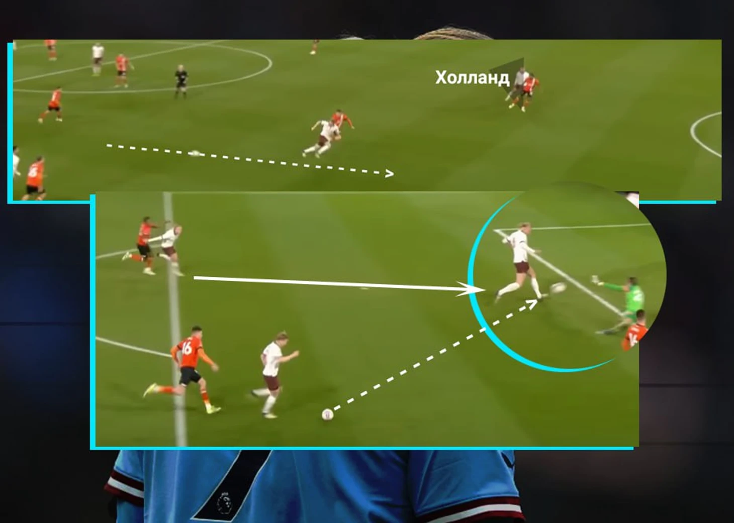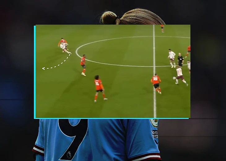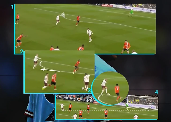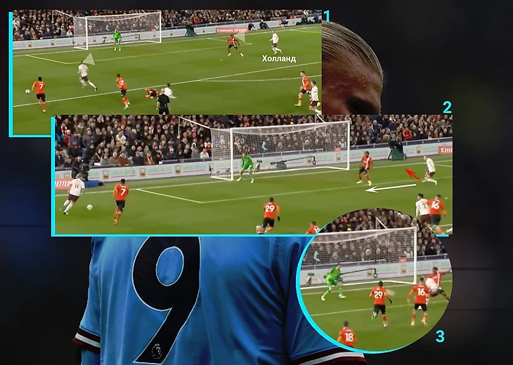 Во втором голе Холланд свое физическое преимущество перед все тем же защитником Лутона. Под плотной опекой Эрлинг смог закрыть мяч корпусом и сбросить его на партнера, а после развернуться и мгновенно набрать скорость. Соперник даже не смог сфолить на норвежце, а догнать его после того, как ты оказался за спиной, уже не представляется возможным: