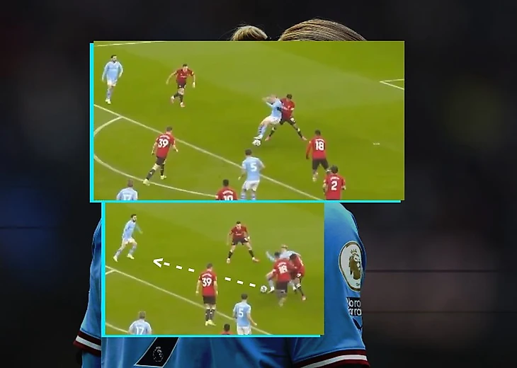 Здесь Холланд снова до момента, когда Де Брюйне готов отдать передачу, находился в слепой зоне защитника (за спиной), и в нужный момент «отрезал» оппонента, закрыв его спиной, в случае чего провоцируя его на фол. В итоге резкая смена направления рывка норвежца позволила замыкать передачу бельгийца без сопротивления: