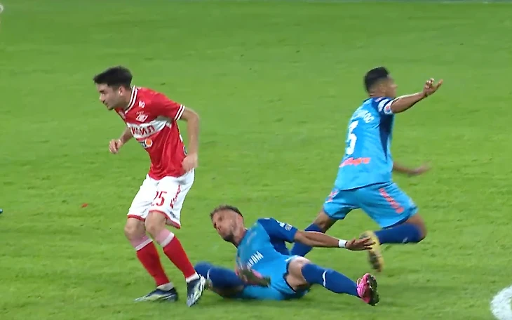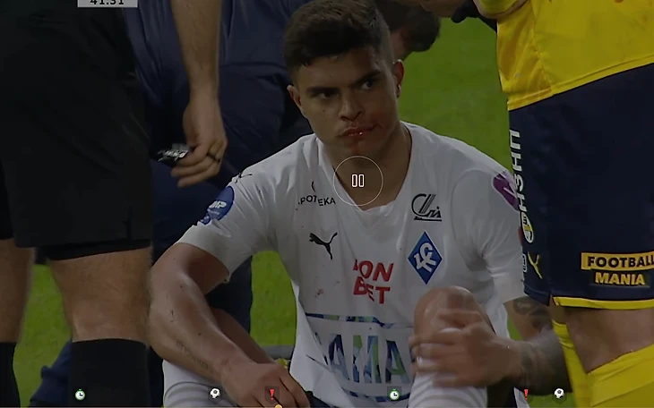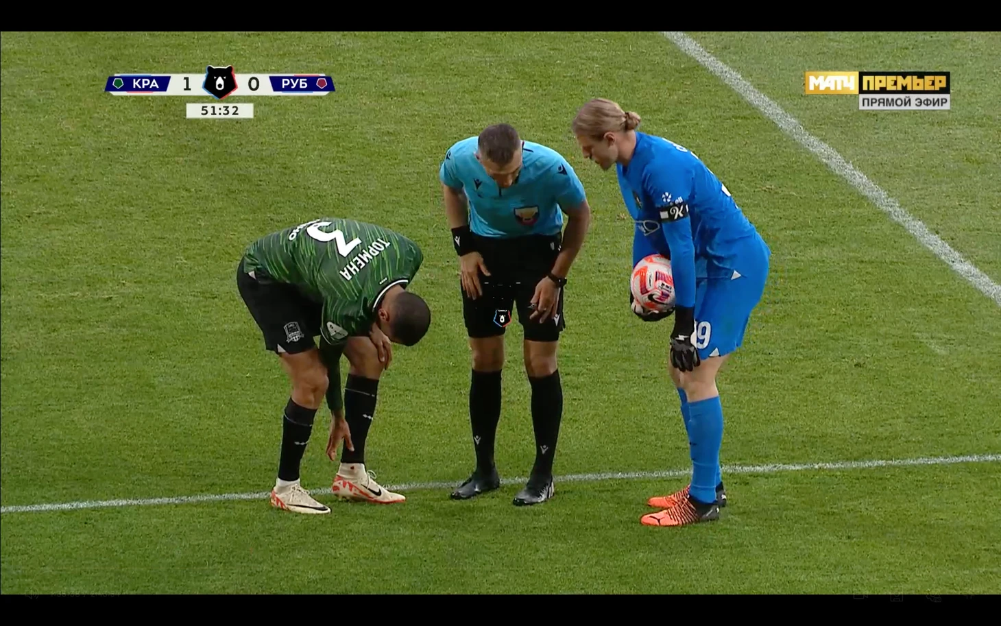51:25 Витор Тормена (Краснодар) показывает судье, что в результате контакта у него появилась кровь в области голеностопа, но игру может продолжать, ничего серьезного
