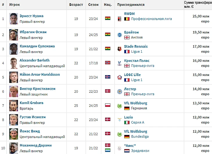 Тройку самых дорогих трансферов Датской Суперлиги захватили ганские футболисты. Датских футболистов всего четверо. Но это не значит что местные футболисты совсем плохи, просто лучшее поколение было чуть раньше, когда цены на футболистов были совсем «копеечными».