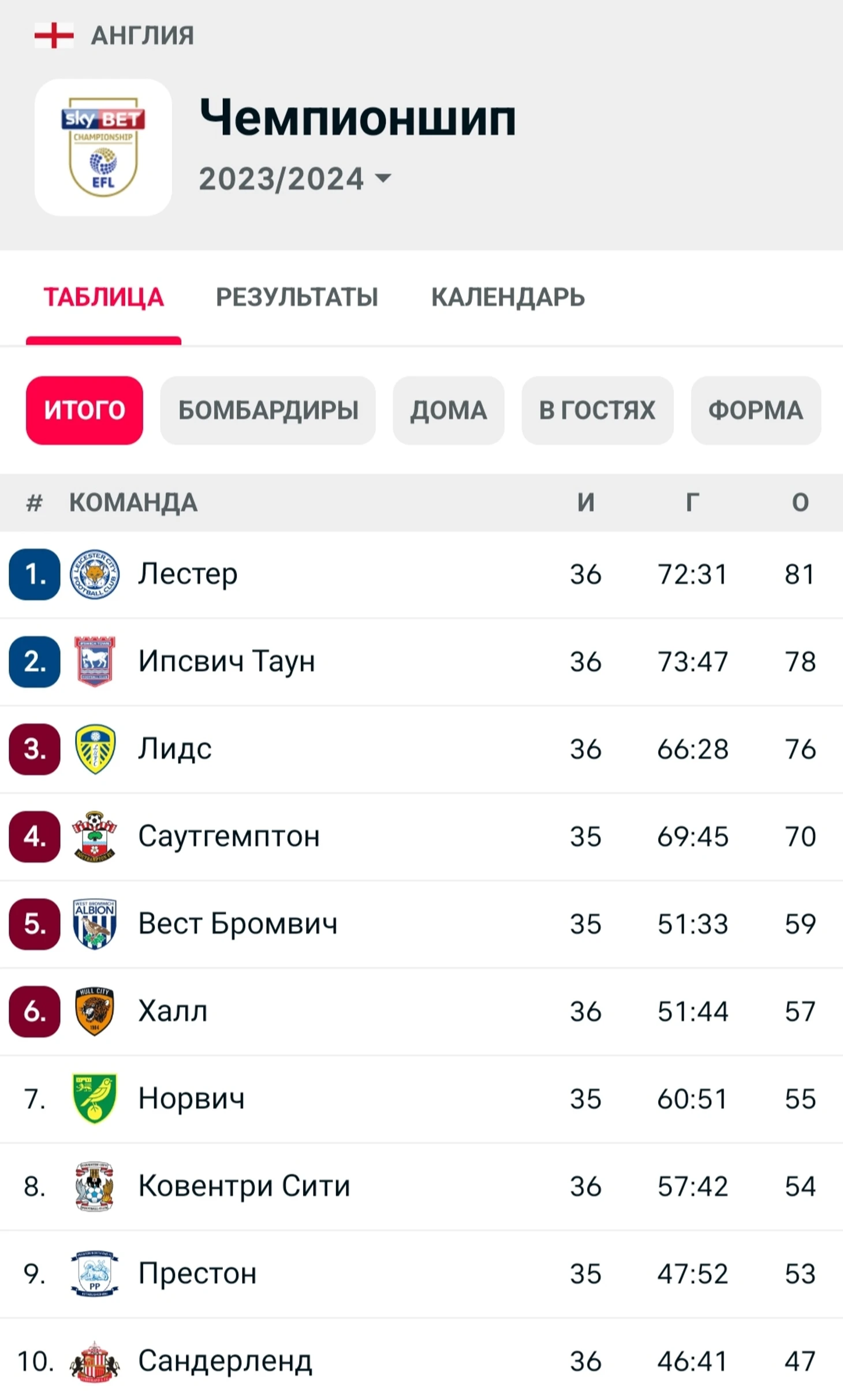 Лидером по-прежнему остаётся «Лестер», в прошлом обзоре «лисы» имели неплохой отрыв даже от второй строчки, но последнее время потерпели три поражения в пяти встречах, имея трёхочковый отрыв от ищущего вторым неожиданно «Ипсвича».Главным творцом в команде является Конор Чаплин, в нынешнем сезоне полузащитник оформил 12 голов и 7 голевых передач, отличный результат для 27-летнего игрока.А вот «Лидс» опустился на третье место, отставая теперь от «Ипсвича» на два очка. Фатальным стала ничья с «Хаддерсфилдом» недавно 1:1, до этого была серия в пять побед подряд, последний тур «Лидс» выиграл у «Сток Сити» 1:0 но пока идет третьим все равно. Отрыв небольшой и интрига сохраняется, кто же выйдет напрямую? Ваши варианты, дорогие читатели. В зоне плей-офф расположились также «Саутгемптон», «Вест Бромвич» и «Халл Сити».Отрыв «Саутгемптона» от второй заветной строчки, дающий прямое попадание в АПЛ составляет восемь очков , «Вест Бромвич» остаёт на девятнадцать а «Халл» и вовсе на двадцать одно очко. Скорее всего эти три команды разыграют между собой третью путёвку через плей-офф, но «Норвич» и «Ковентри» очень близки к 6-му месту, отрыв составляет всего два и три очка соответственно, кто знает, как в итоге закончится эта гонка за место в плей-офф.