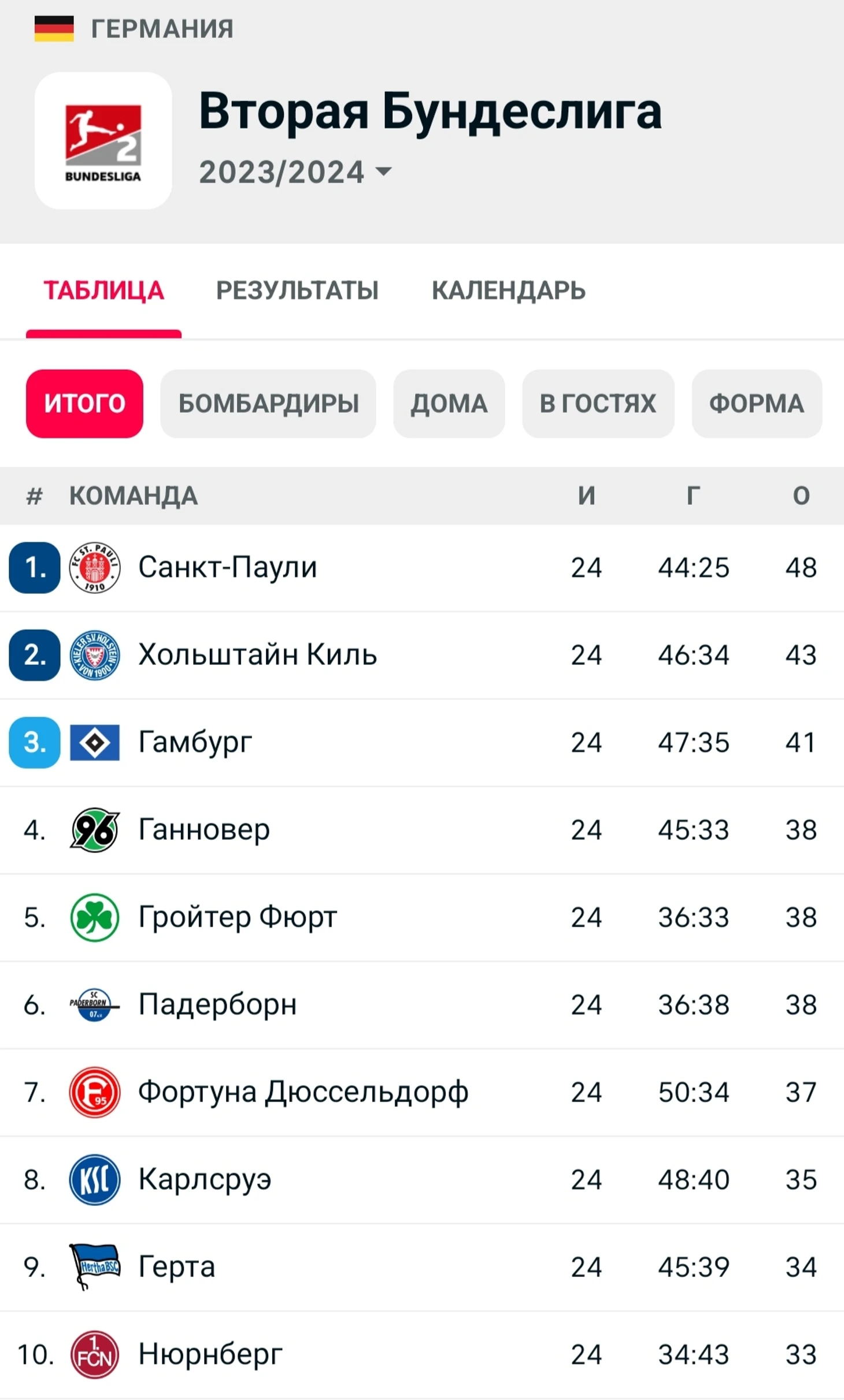 Лидирует «Санкт Паули» с отрывом в пяти очков от идущего вторым «Хольштайн Киль», примечательно, что обе команды проиграли свои последние матчм, но « Гамбург» который раз уже допускает осечки, несколько игр сыграв вничью и отставая от второй строчки на два очка. Третье место даёт право сыграть в переходном матче с командой из Бундеслиги, занявшей 16-е место. «Гамбург» ещё сохраняет шансы выйти напрямую, но надо наладить победный путь. «Ганновер», «Гройте Фюрт», «Падеборн» так же близки к третьему месту и отстают лишь на три балла. Интересная борьба и остаток сезона, кто выйдет в Бундеслигу?