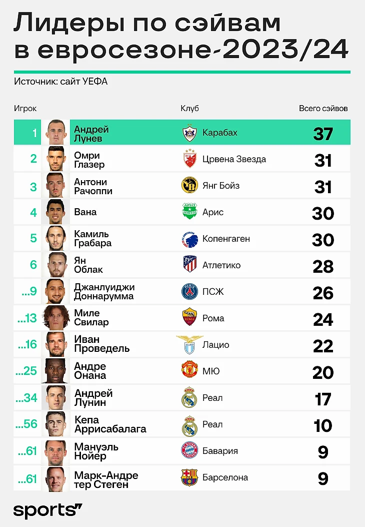 Эта статистика учитывает матчи Лиги чемпионов и Лиги Европы, начиная с группового этапа: Лунев провел шесть игр осенью и уже две в плей-офф. В разных источниках чуть отличаются данные, будем опираться на официальный сайт УЕФА.