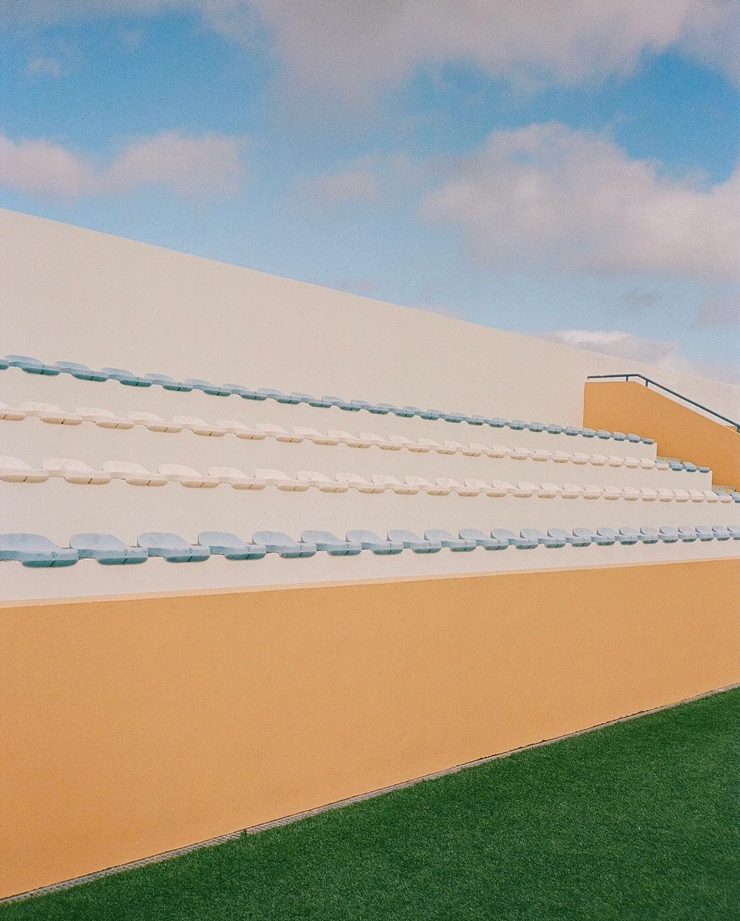 Основная его трибуна светлого цвета, чтобы слиться с природой, а низкая трибуна не загораживает окружающий пейзаж.