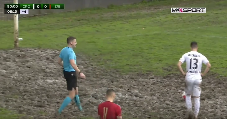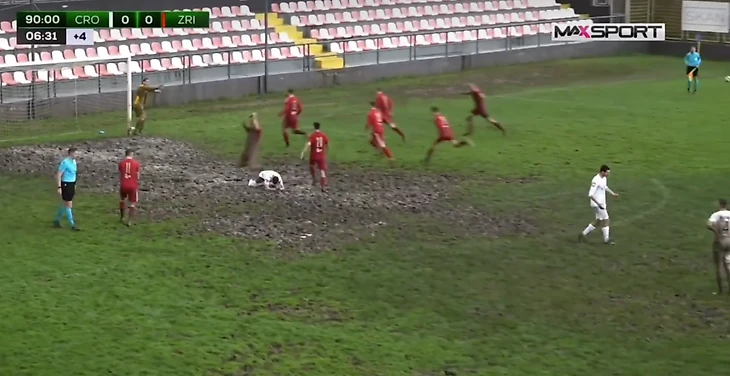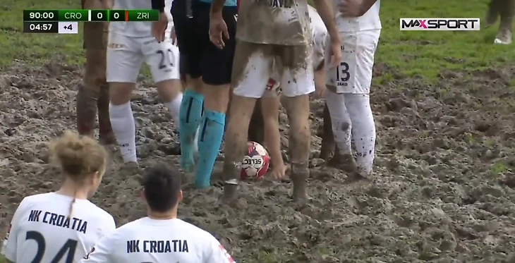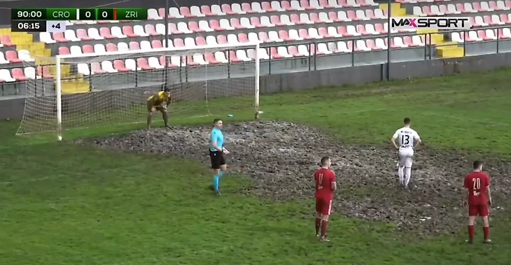 Первая хорватская лига, напряженный матч – и особенный колорит: пенальти на последней минуте, перед исполнением которого нужно тщательно установить мяч в жуткой грязи.