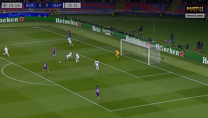 На 30-й минуте «Наполи» все-таки ответил: Маттео Политано открылся в штрафной и откатил набежавшему вторым темпом защитнику Амиру Ррахмани. Он ударил с ходу щечкой.