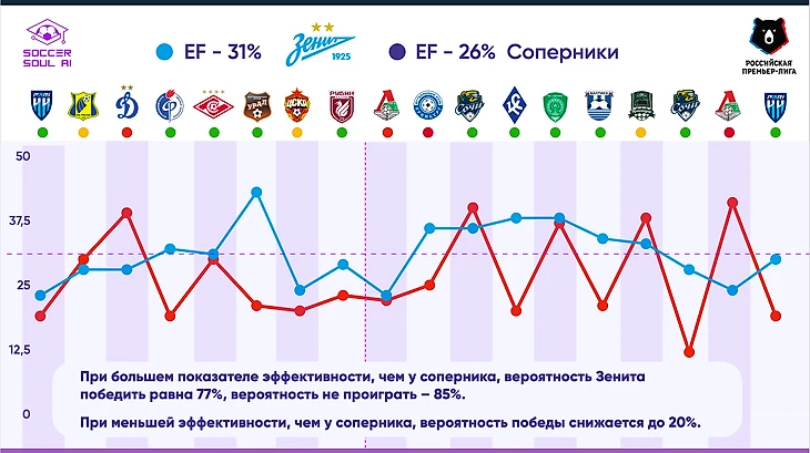💡Эффективность продвижения мяча - отношение баллов, набранных командой в фазе завершения атак к общему Soccer Soul IQ.