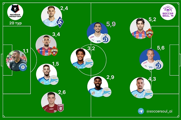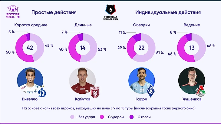 Аналогично командным метрикам, разбираются показатели каждого игрока, что позволяет формировать символическую сборную тура, сезона, сборов, выявлять плюсы и минусы, сопоставлять синергию игроков, одновременно выходящих на поле. С начала сезона 2023 – 2024г.г. проект собрал базу по всем футболистам, появлявшимся на поле в РПЛ.