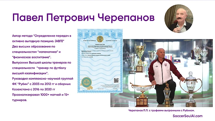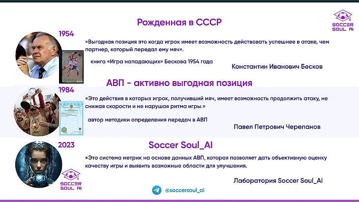 Методика у истоков которой в 50-е годы стоял Константин Иванович Бесков, адаптирована под современные реалии футбола, командой лаборатории футбольной аналитики - Soccer Soul AI при участии Павла Петровича Черепанова (автора методики определения передач в АВП) и группы российских тренеров.