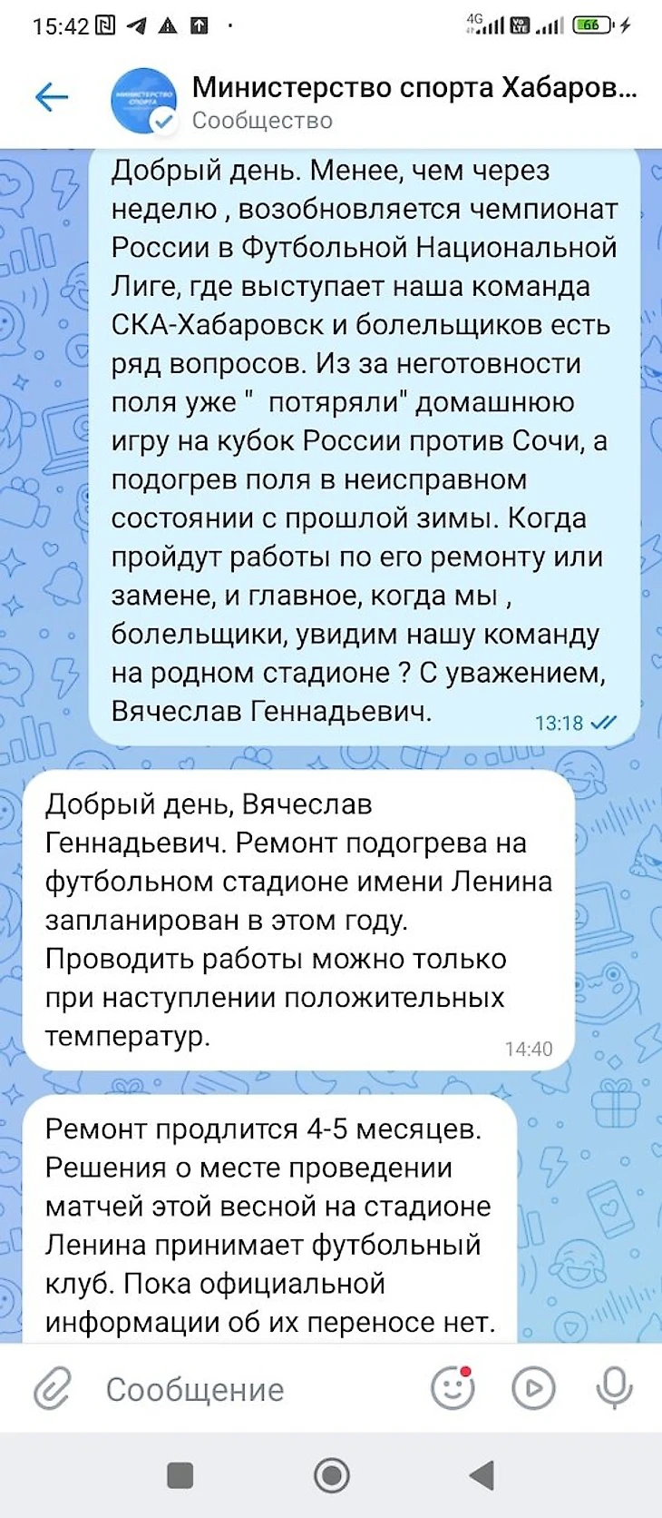 ● В соцсетях гуляет скрин: хабаровский Минспорта ответил болельщику, что ремонт подогрева на стадионе запланирован в этом году. И на него потребуется четыре-пять месяцев.