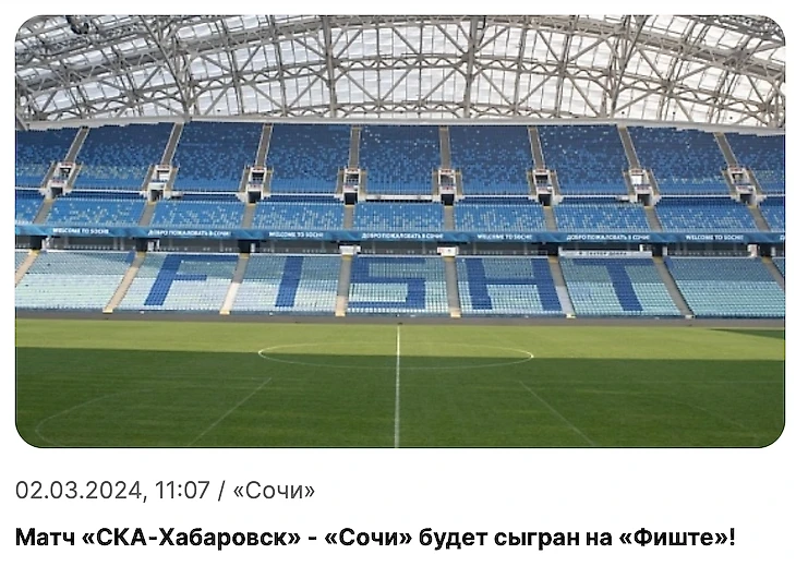 «Изменить место проведения на стадион «Фишт» (Сочи), заявленный резервным, без изменения у «СКА-Хабаровска» статуса принимающего клуба», – говорилось в объявлении.