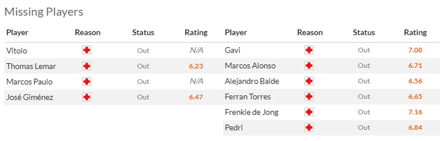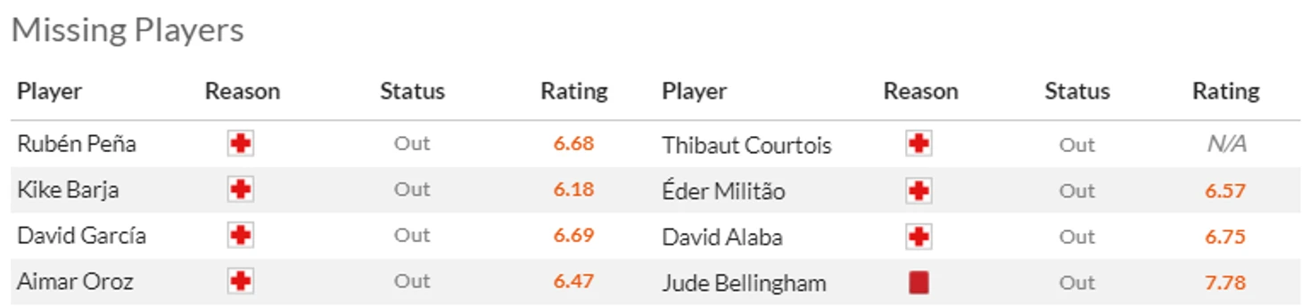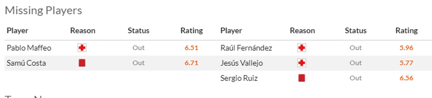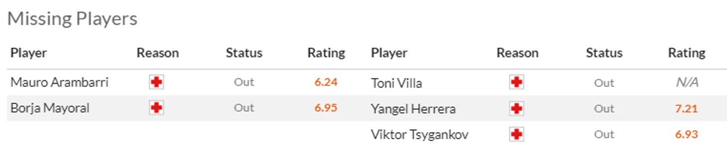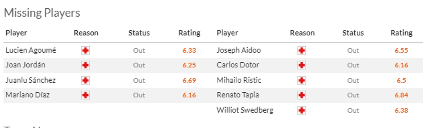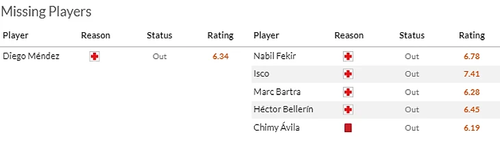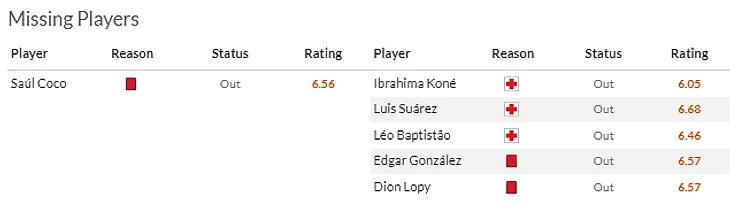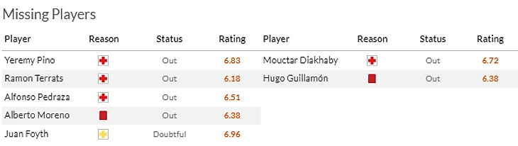 В любом случае не помогут гостям отхвативший двухматчевую дисквалификацию Альберто Морено(5,5) и травмированные Альбиоль(5,5) с Педрасой(6). Также возможно пропустят тур восстанавливающиеся от болячек Байи(5.5) и Рейна(5,5). Гости в свою очередь не смогут рассчитывать на забаненного Гильямона(6,5).