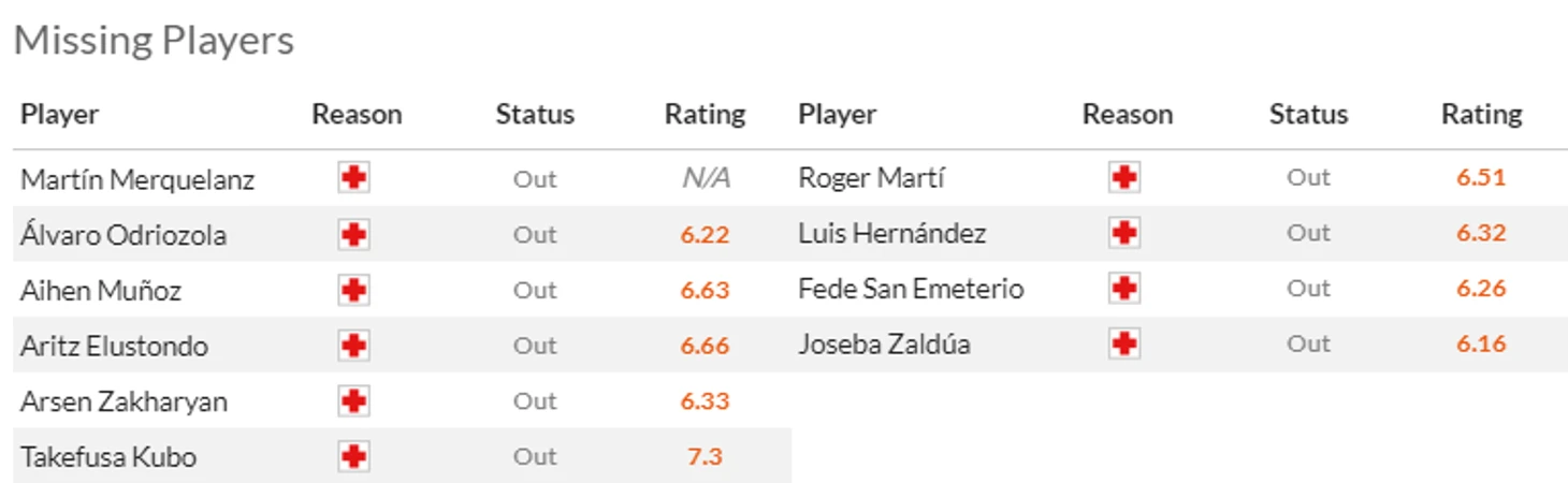 На что обратить внимание: На Такуфусу Кубо(8). Японец по болезни пропустил матч прошлого тура и не поучаствовал в эффектном комбэке против Гранады, но за неделю вингер победил свои болячки и попал в заявку басков на сегодняшнюю игру. Также вошли в список вызванных Аритц Элустондо(6) и Арсен Захарян(7).