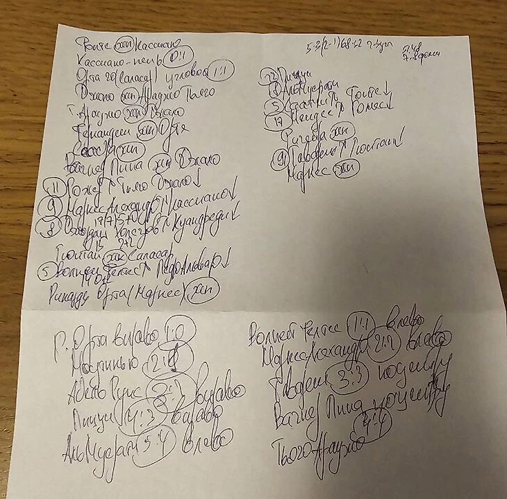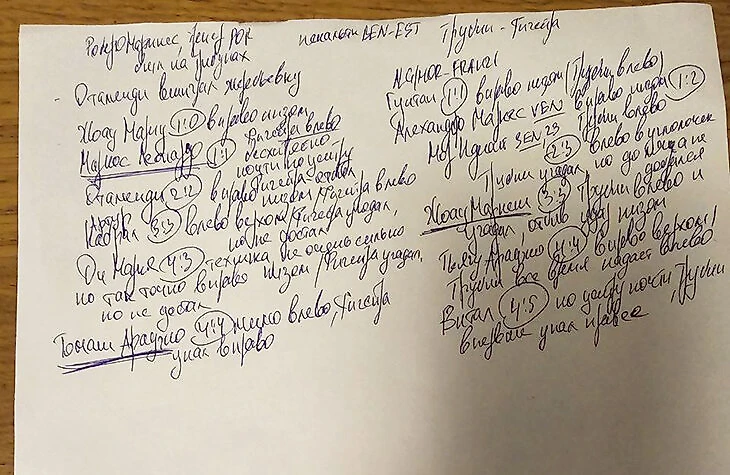 Моя шпаргалка такая: рисую схему команды, уточняю номера игроков, а под каждым из них прописываю обязательный факт, который нужно знать. Обычно готовлю два листочка – по одному на команду.