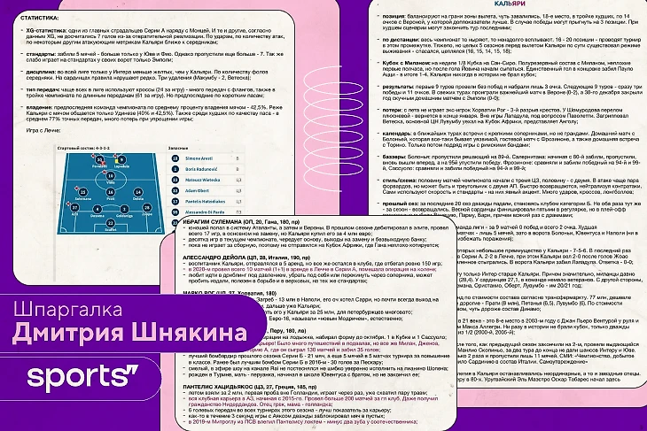 Я принципиально пользуюсь ноутом, а не рукописными шпаргалками: легко отматываешь на необходимого игрока и находишь нужное, а потом обновляешь/переносишь файл перед следующей игрой. Звучит удивительно, но к матчу «Кальяри» могу готовиться дольше, чем к финалу Лиги чемпионов. Просто потому, что там играют звезды, а про звезд и так все все знают. Впрочем, про них тоже можно и нужно раскапывать что-то оригинальное или актуальное.