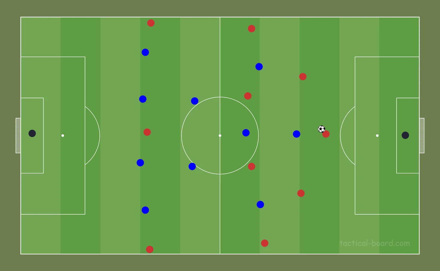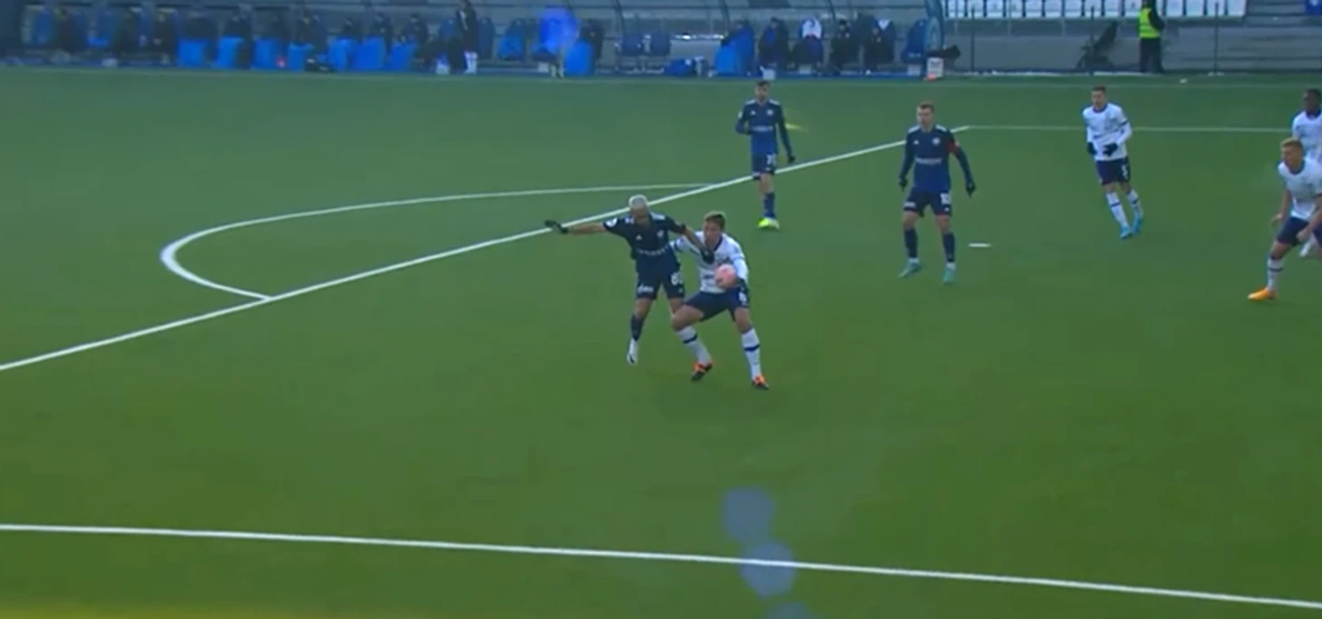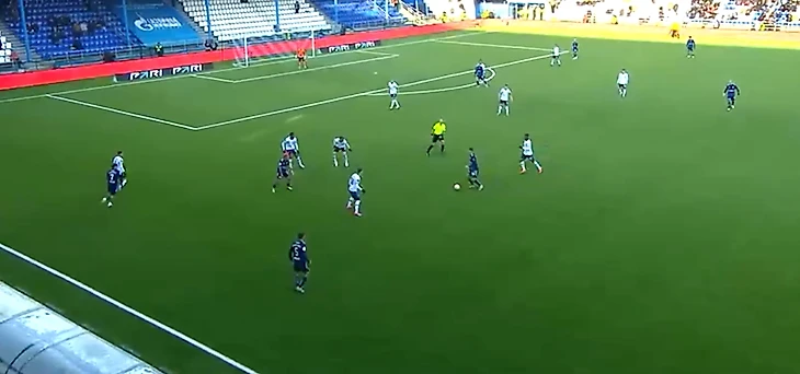 Начнём с гостей. Они были достаточно активны в прессинге, редко опускались в средние или низкие блоки, что позволяло им чаще контролировать мяч. Оренбург редко пытался выйти из-под прессинга низом, и правильно: зачем рисковать игрой на своей половине поля, если у тебя впереди Мансилья. Оренбуржцы перешли на длинные передачи, Брайан отлично цеплялся, оставляя мячи у своей команды. При этом всём акцентированных моментов у хозяев не было. Гораздо интереснее был выход Балтики в атаку. Оренбург играл вторым номером, очень редко идя в прессинг. При контроле мяча схема калиниградцев менялась с 3-4-3 на 3-2-2-3 (3-6-1).