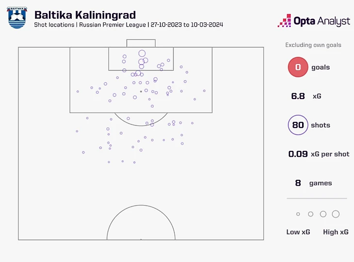 0 голов при xG 6.8 – это ужас. Балтика уже не забивает 8 игр в РПЛ – по этому показателю они в тройке за всю историю: