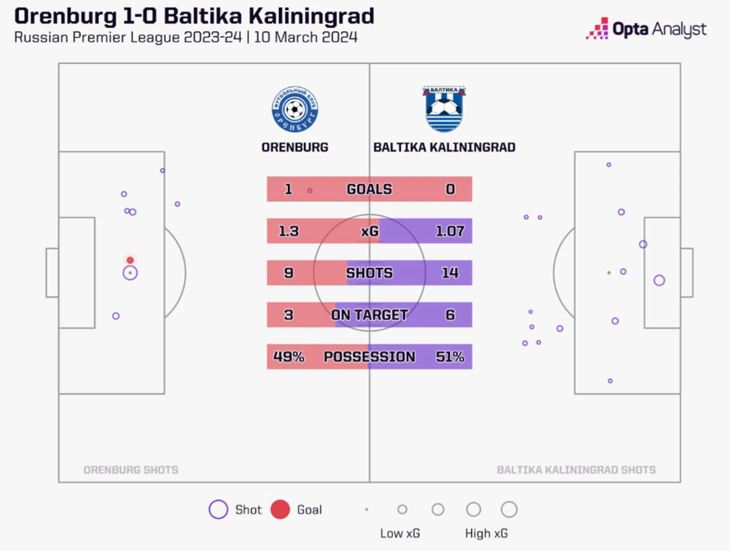 В статистике отражён весь матч; игра была примерно равной с небольшим перевесом в пользу Балтики. xG в статистике, как я считаю, несправедлив. Балтика имела минимум 4 момента, которые не реализовать было тяжело, но калининградцы это сделали!!! Проблемы с реализацией у балтийцев давно, последние восемь игр и суммарное количество ожидаемых голов перед вами: