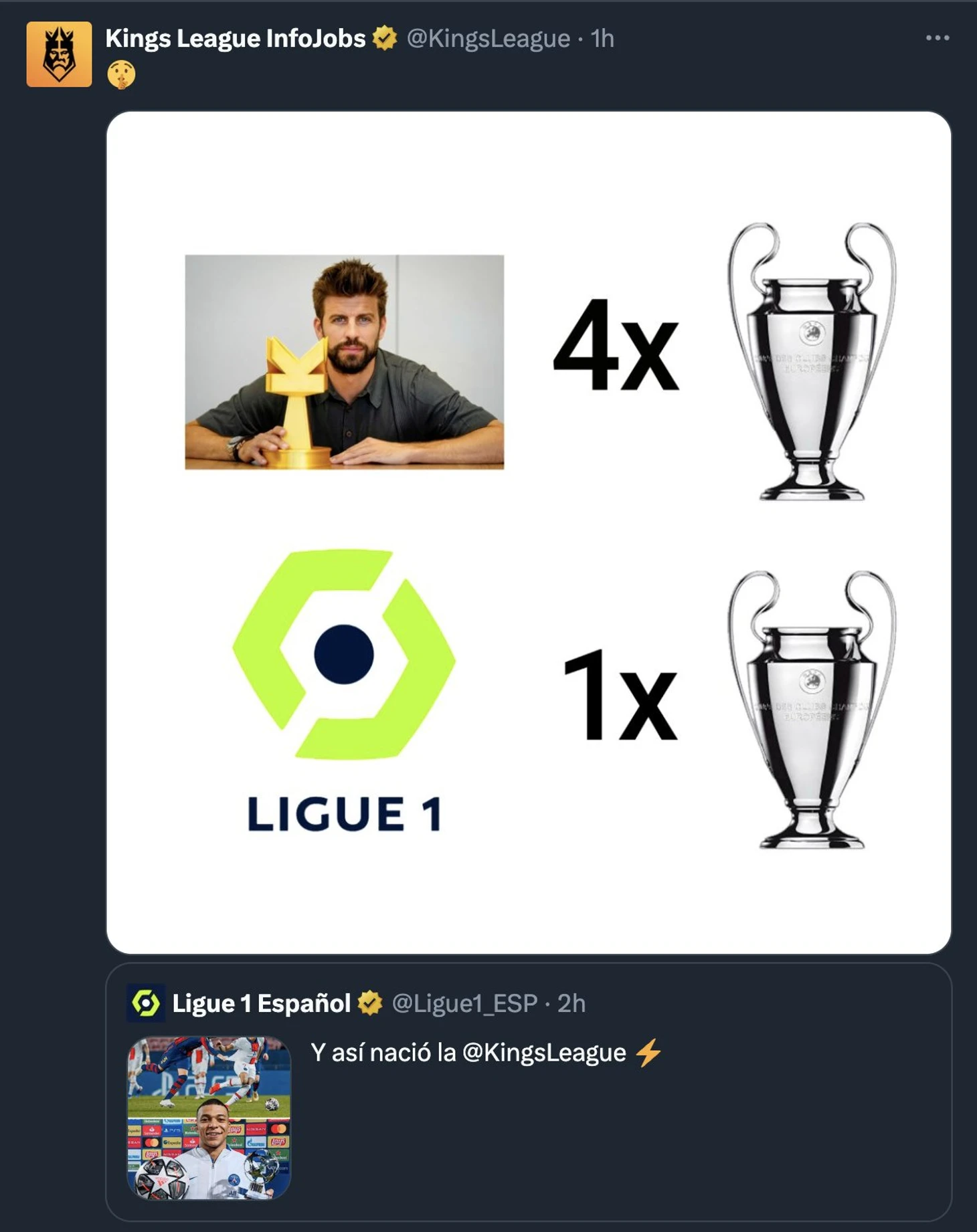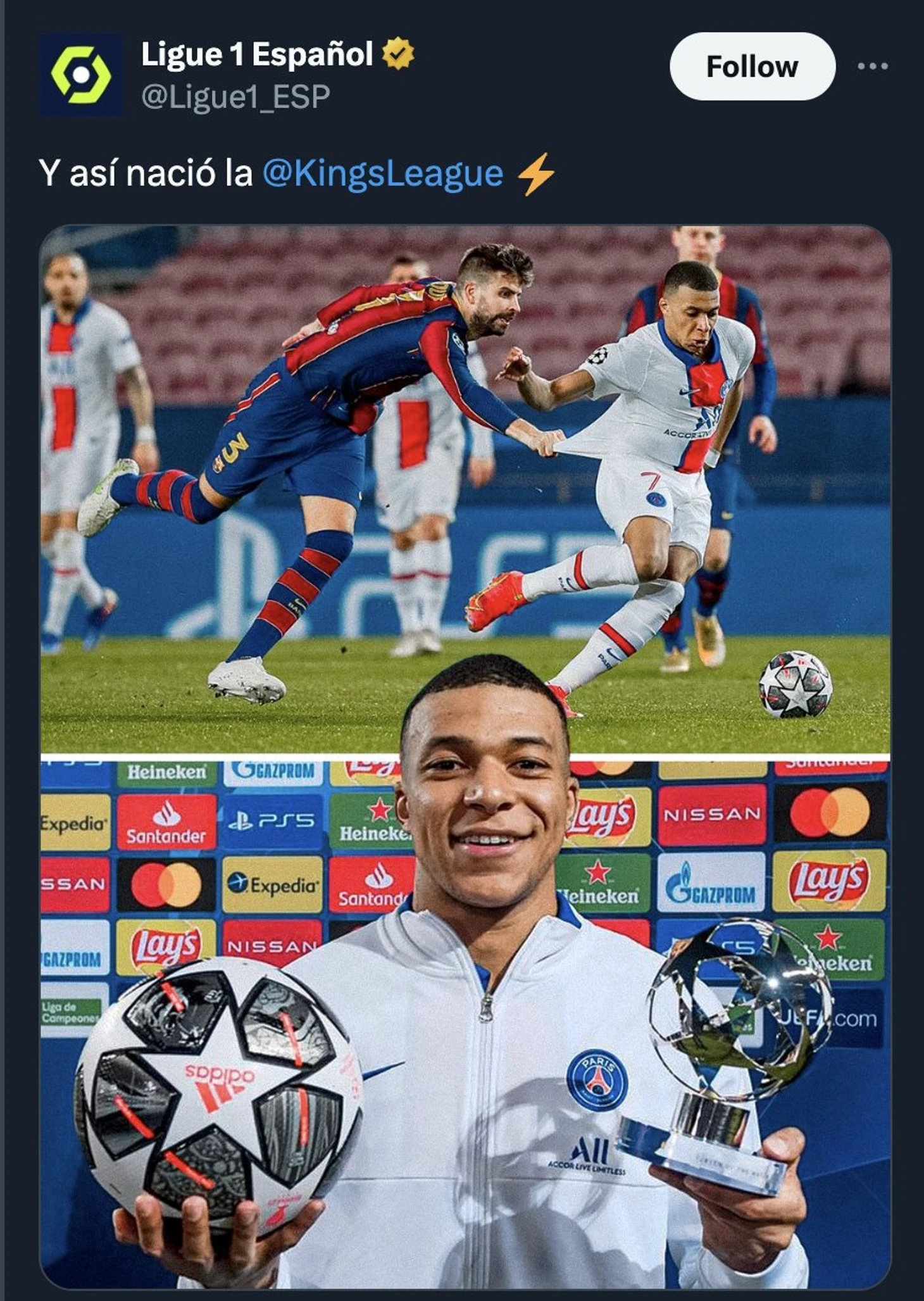 После жеребьевки 1/4 ЛЧ этого сезона испаноязычный аккаунт Лиги 1 в X решил подколоть «Барсу» и Пике. В профиле появился ироничный пост: «И вот так родилась Кингс Лига».