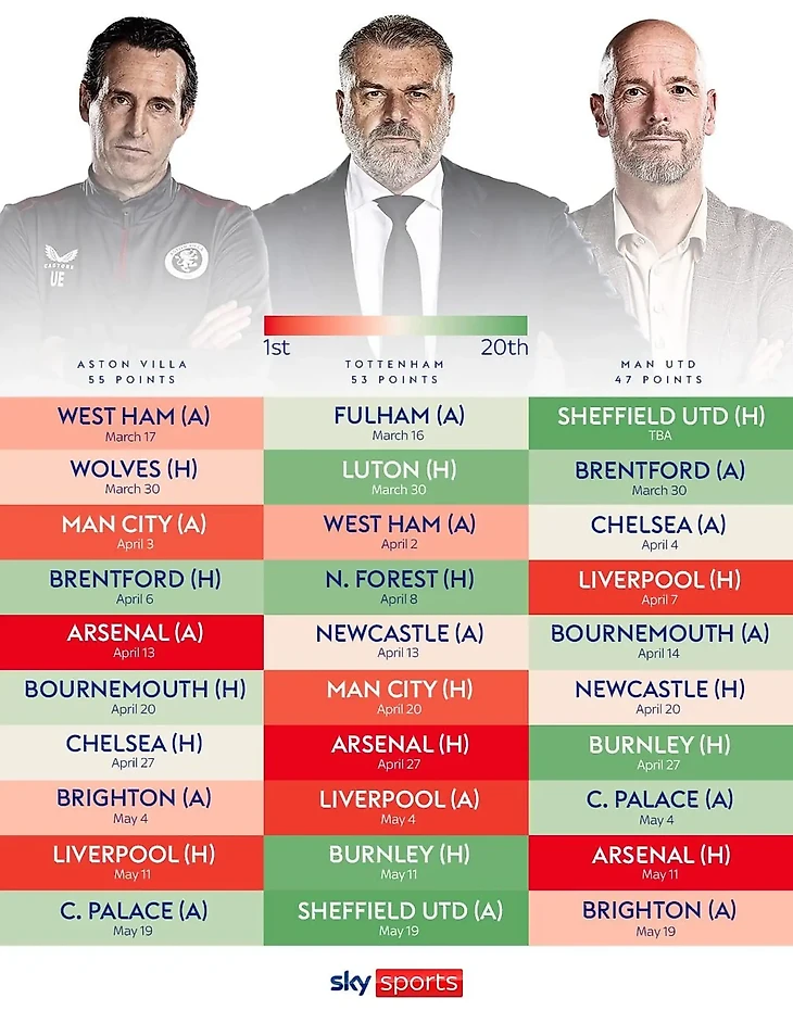 Британский Sky Sports составил удобную таблицу, которая оценивает сложность календаря трех команд-претенденток. Цвет каждого клуба зависит от места, которое он занимает в таблице: чем краснее, тем выше и сложнее, чем зеленее, тем ниже и легче.