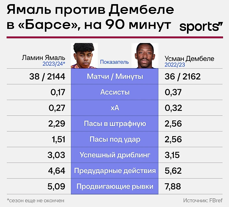 Прошлогодний Дембеле доминирует во всем. Это не попытка принизить Ямаля: в 16 лет не меркнет на фоне одного из лучших вингеров того сезона, под которого подстраивался тренер. Высочайшая планка остроты, которая до сих пор не покорилась Рафинье. Ламин на фоне Усмана – некритичная просадка в плане игры, бесплатный и с огромным потенциалом.