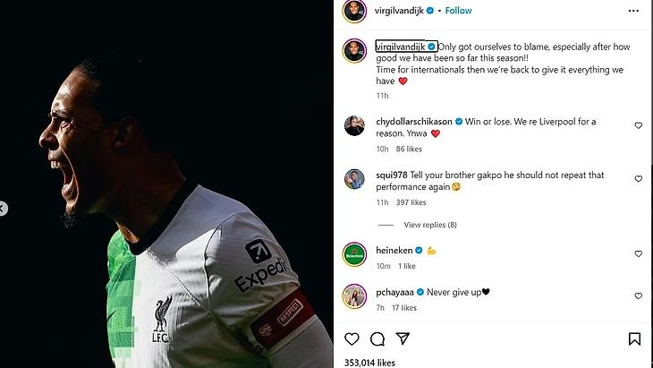 «Мы можем винить только себя, тем более с учетом того, как хорошо мы играем в этом сезоне. Сейчас стартует международный перерыв, но потом мы вернемся, чтобы снова отдавать все силы», - написал Ван Дейк.